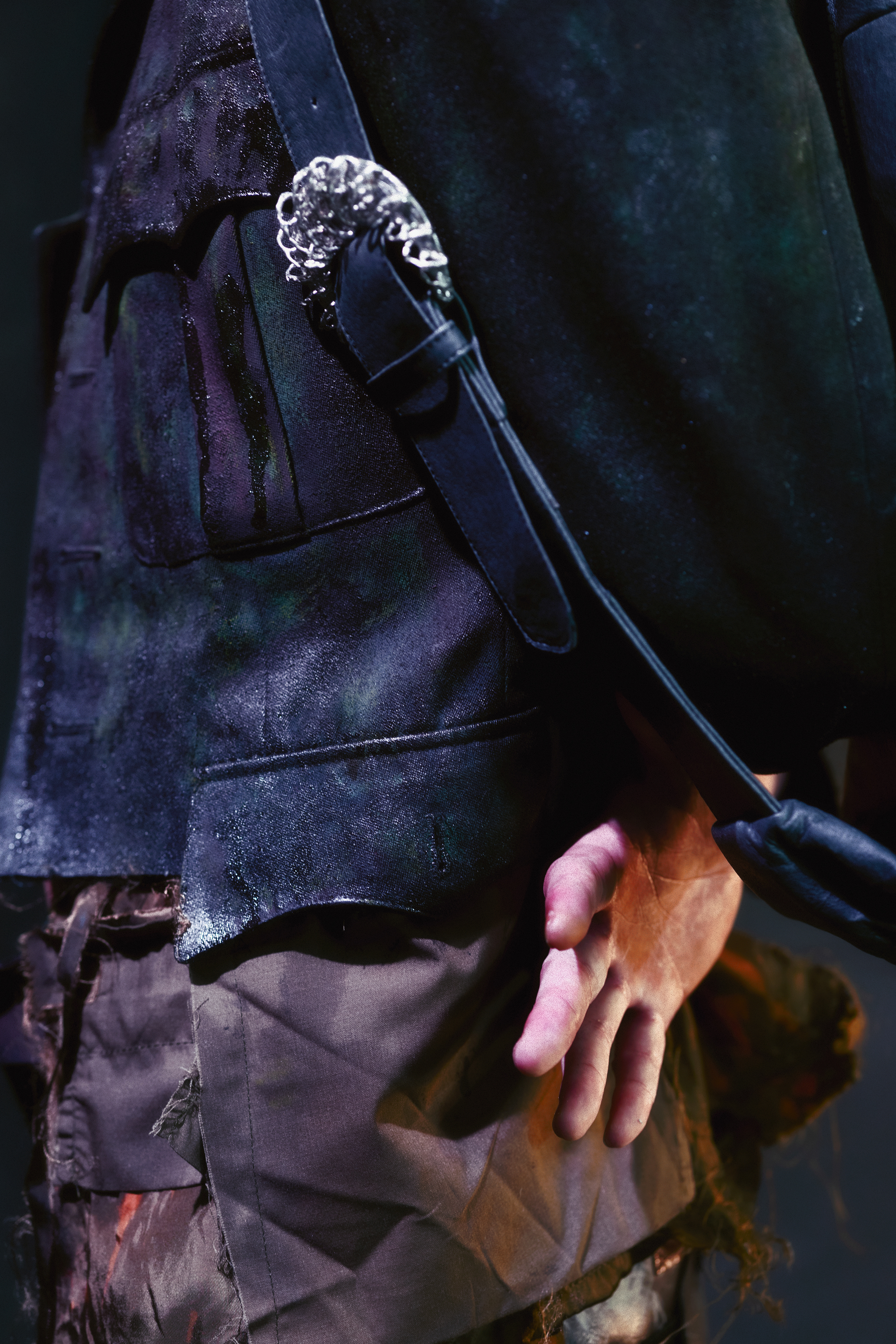 Its jagged buckles, handmade by Felurian Doll, root the piece in a territory between ornament and feral relic.
