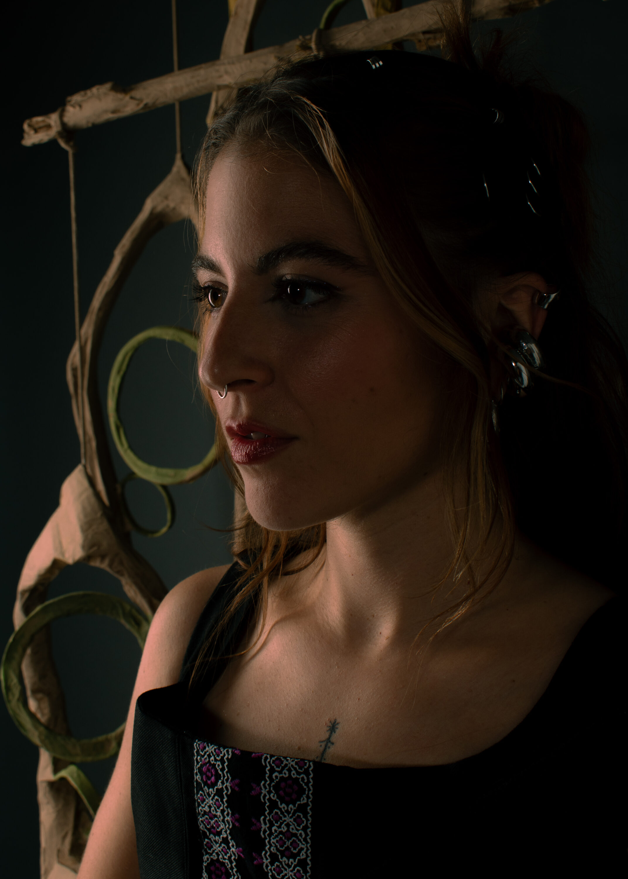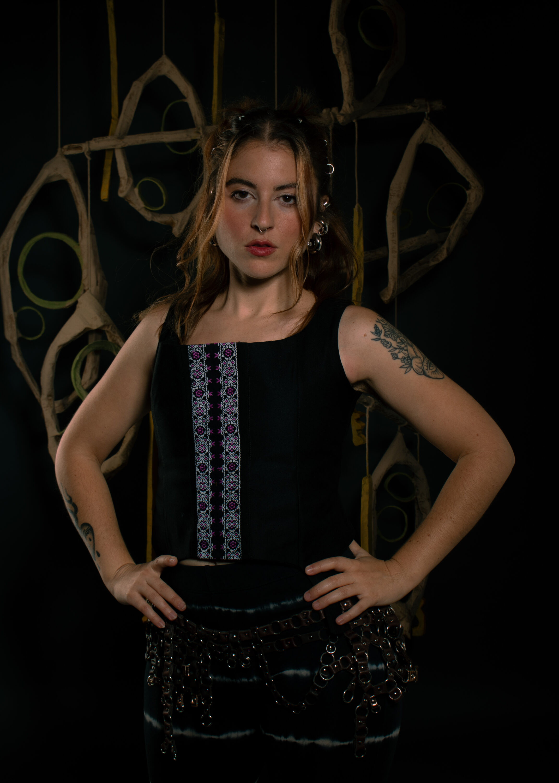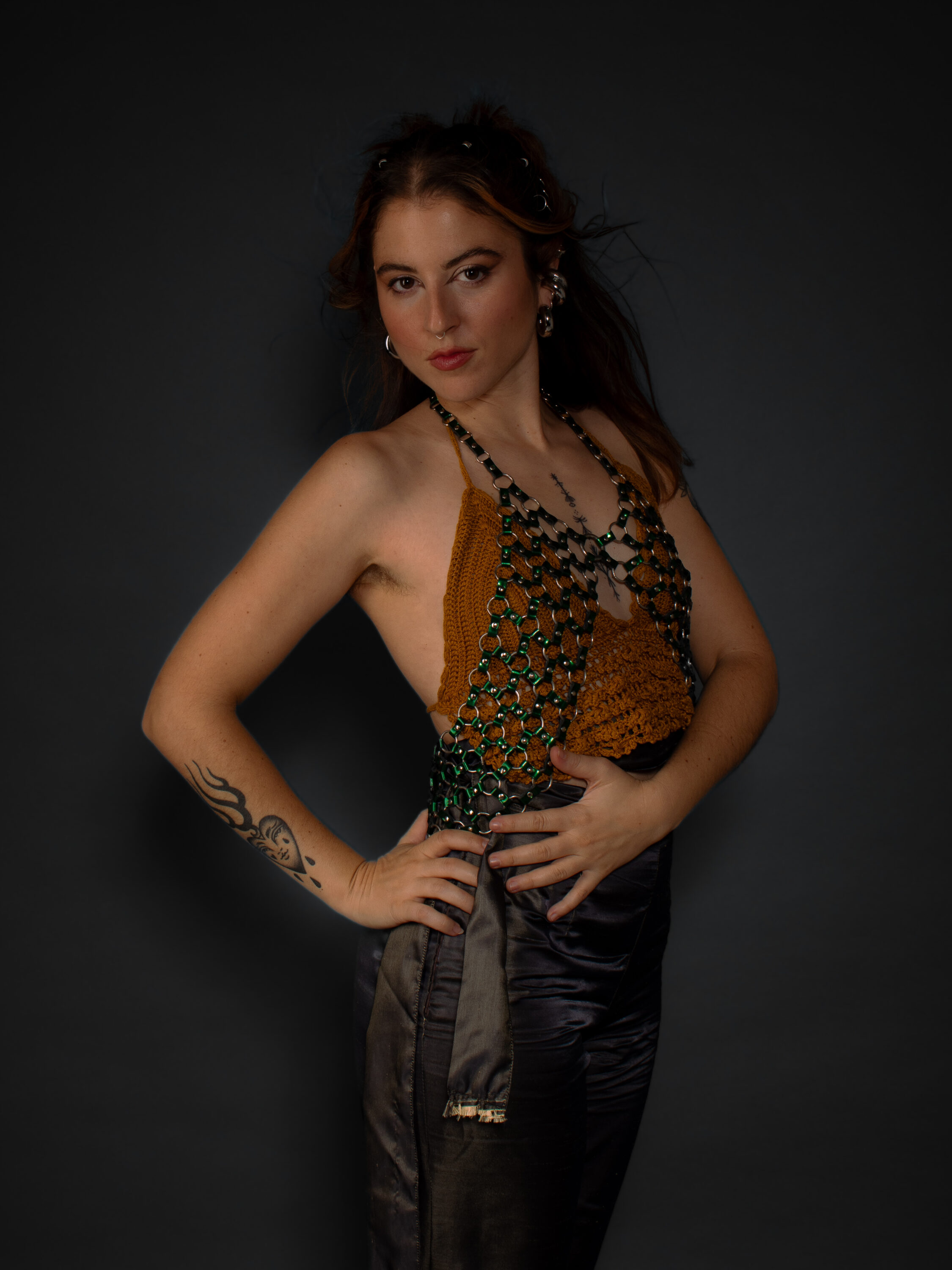 El universo visual de «Vuelve» se vistió con prendas nacidas de la recuperación y la experimentación: piezas que combinan tejidos reciclados, estructuras de cuero y ornamentos artesanales. Una estética áspera y luminosa a la vez, que acompañó el disco en su viaje de retorno a lo íntimo sin perder la fuerza de lo colectivo. Cada look surgió como una extensión del relato musical, en diálogo con la memoria, la raíz y el presente compartido.