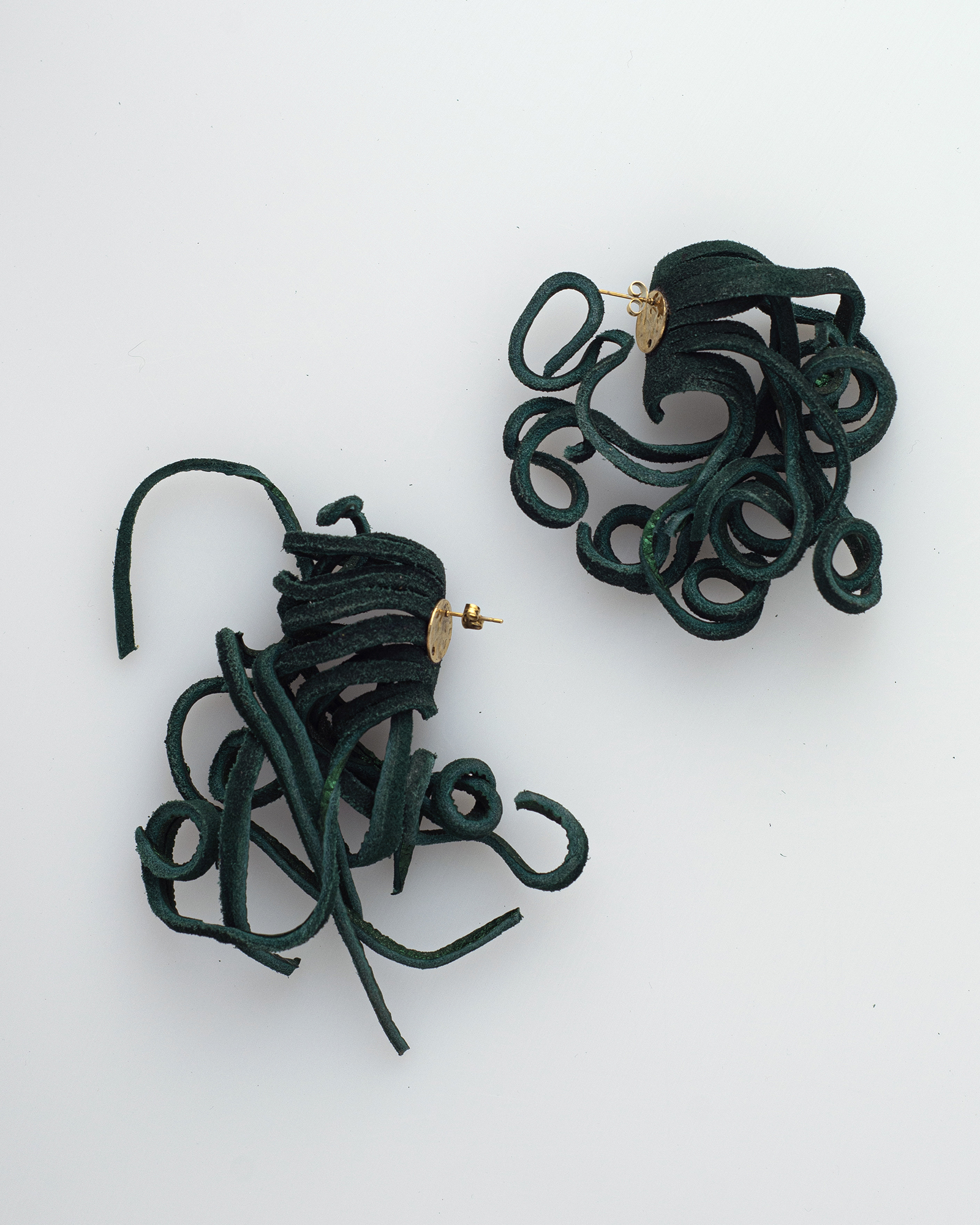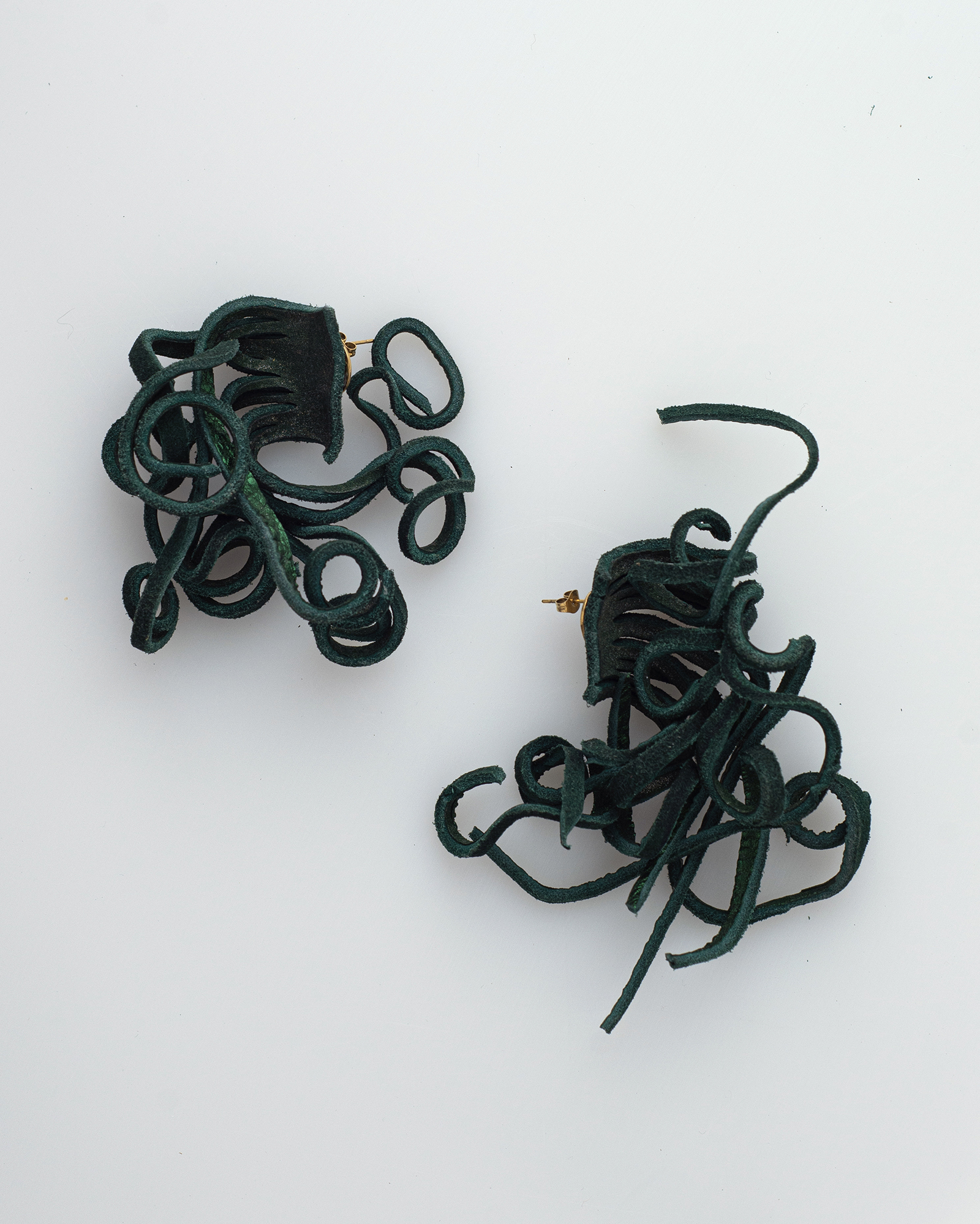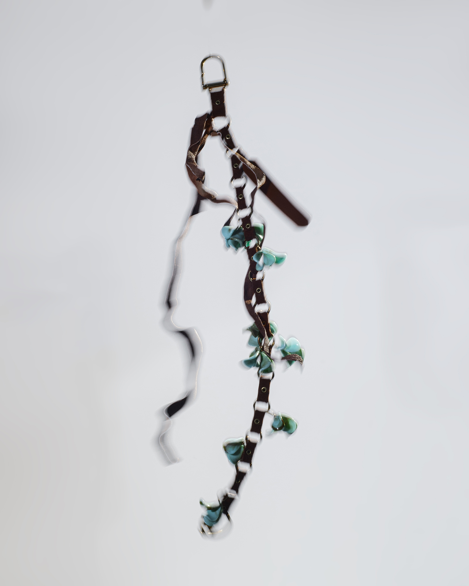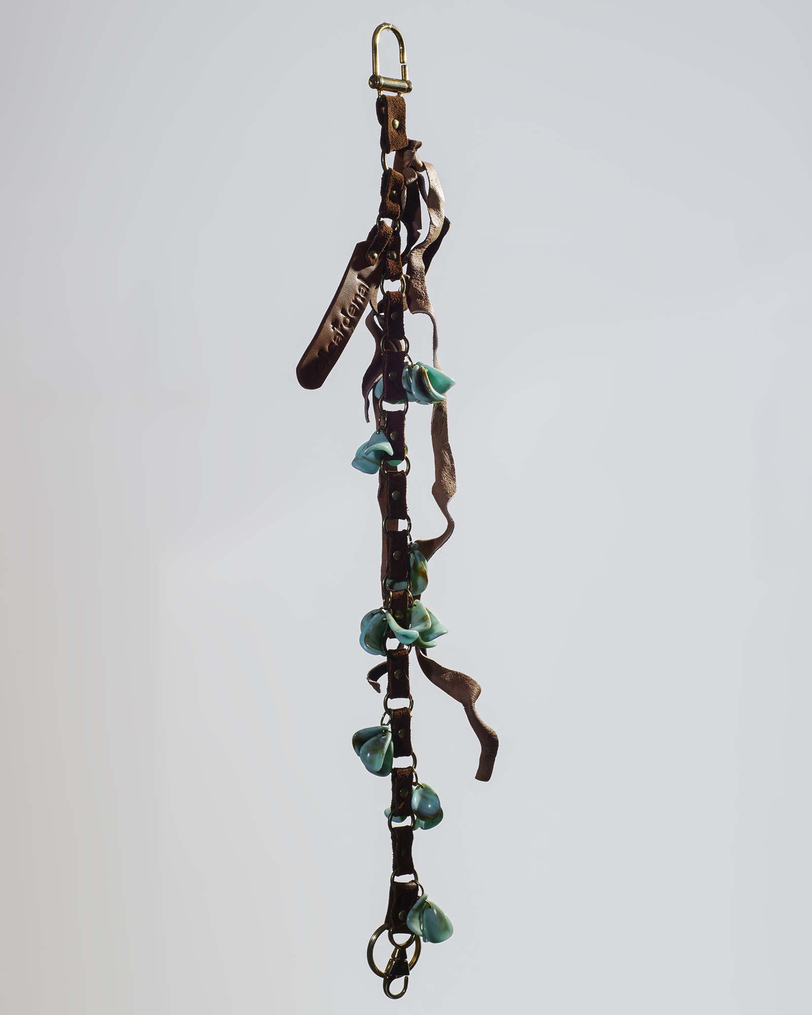 Headpiece made by hand with the technique of interlocking leather and metal shackles. This technique creates beautiful chains with great resistance and durability. It can be personalized choosing the color of the leather pieces and the hardware, which can be golden or silver.