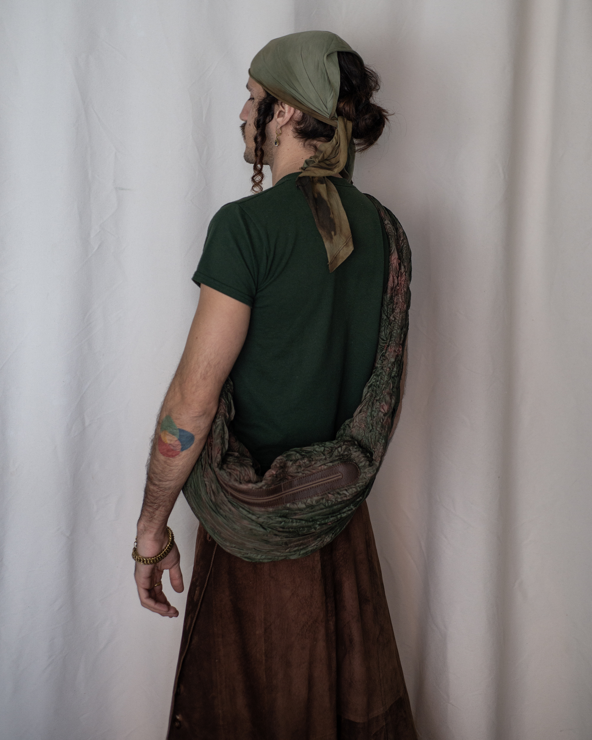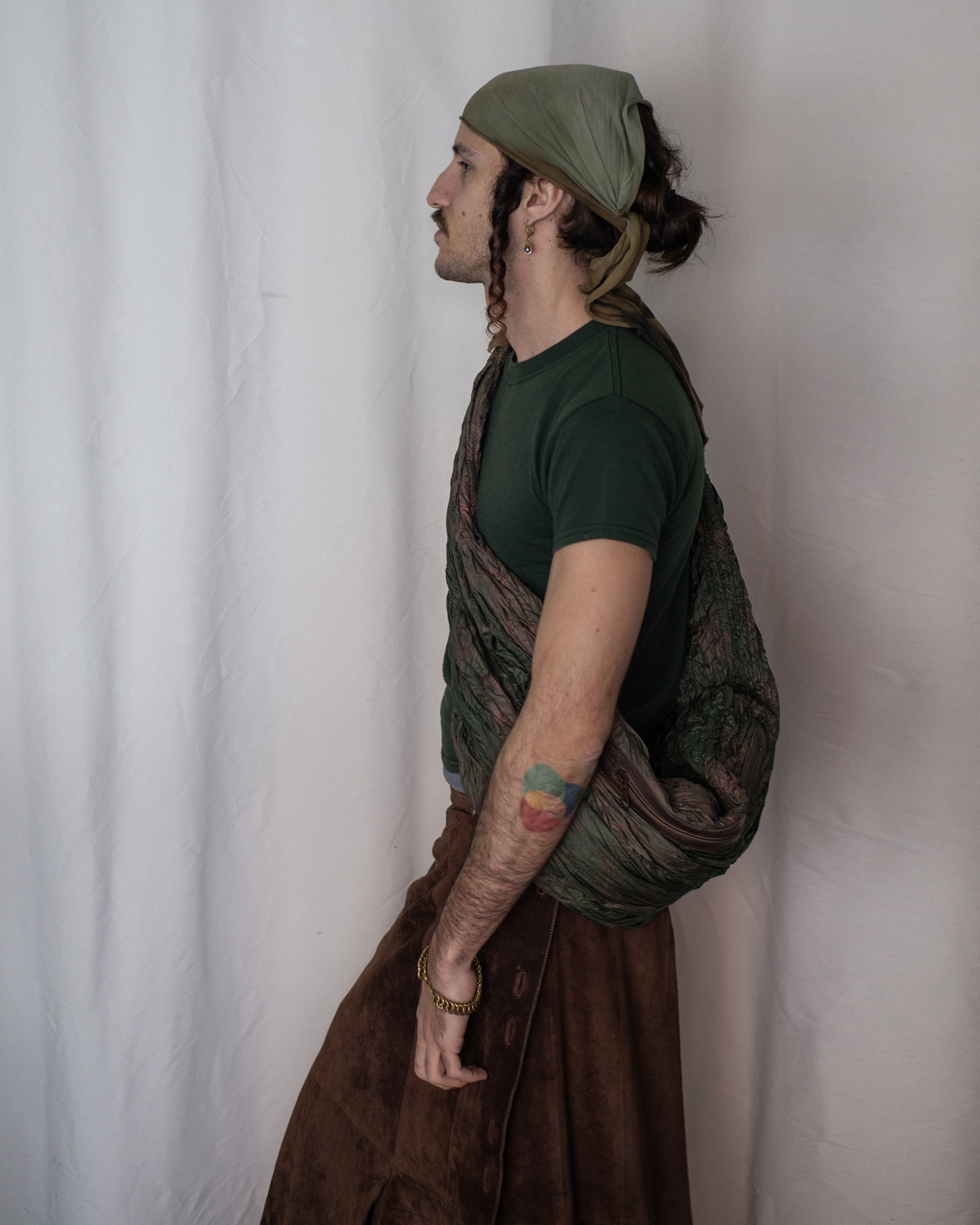 Está confeccionado en loneta de algodón teñida e impermeabilizada a mano en el atelier. El acabado facilita la limpieza y refuerza el carácter utilitario de la prenda. Incorpora detalles en cuero que elevan la pieza y articulan su estructura: tira regulable para el cuello, correa regulable en la cintura y bolsillos laterales. Cuenta con un gran bolsillo central tipo canguro, mosquetón y tira para herramientas.