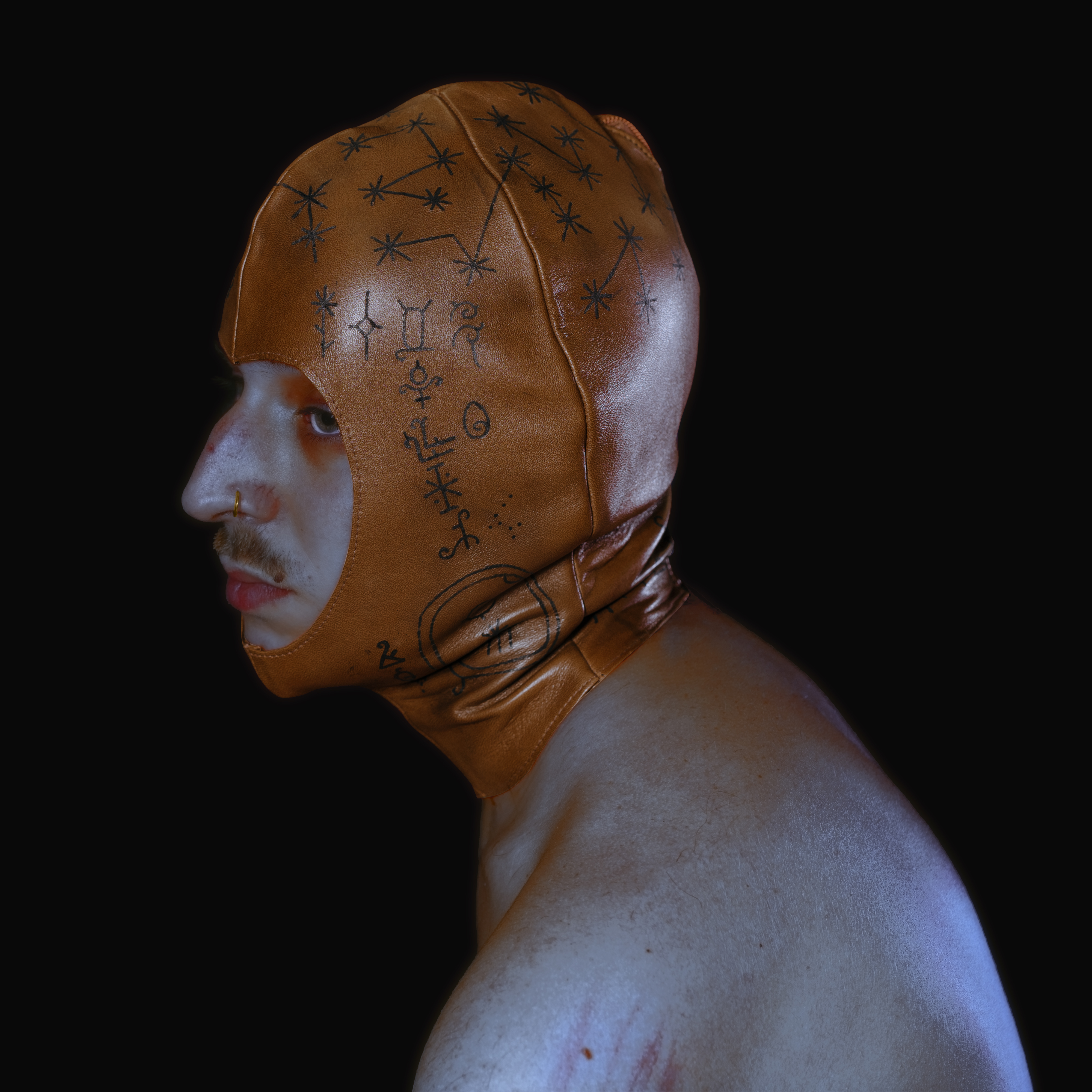 Un colgante donde un aro dorado queda atrapado dentro de una pieza de cuero azul, suspendido de un cordón de cuero crudo. Sencillo y simbólico.