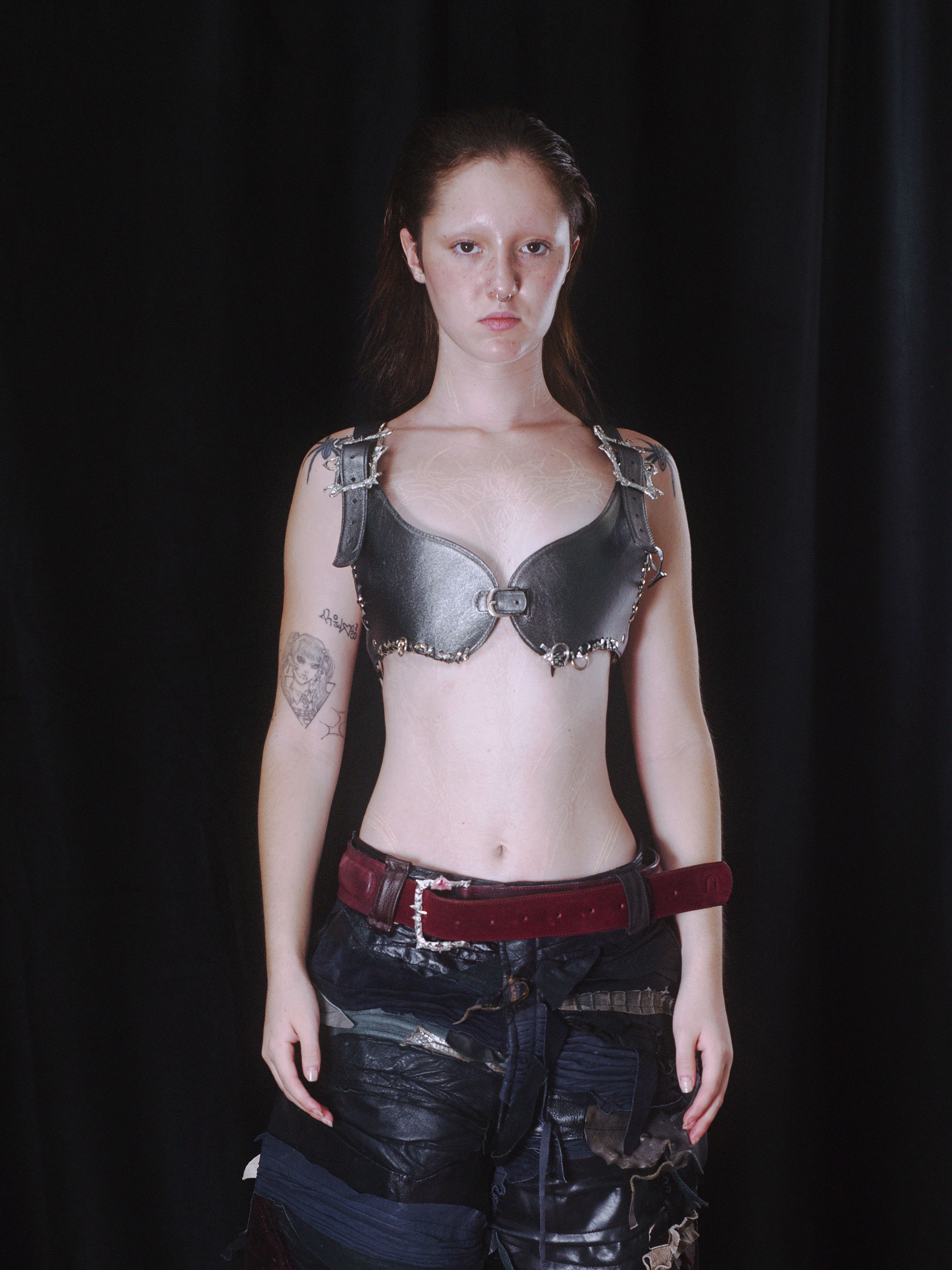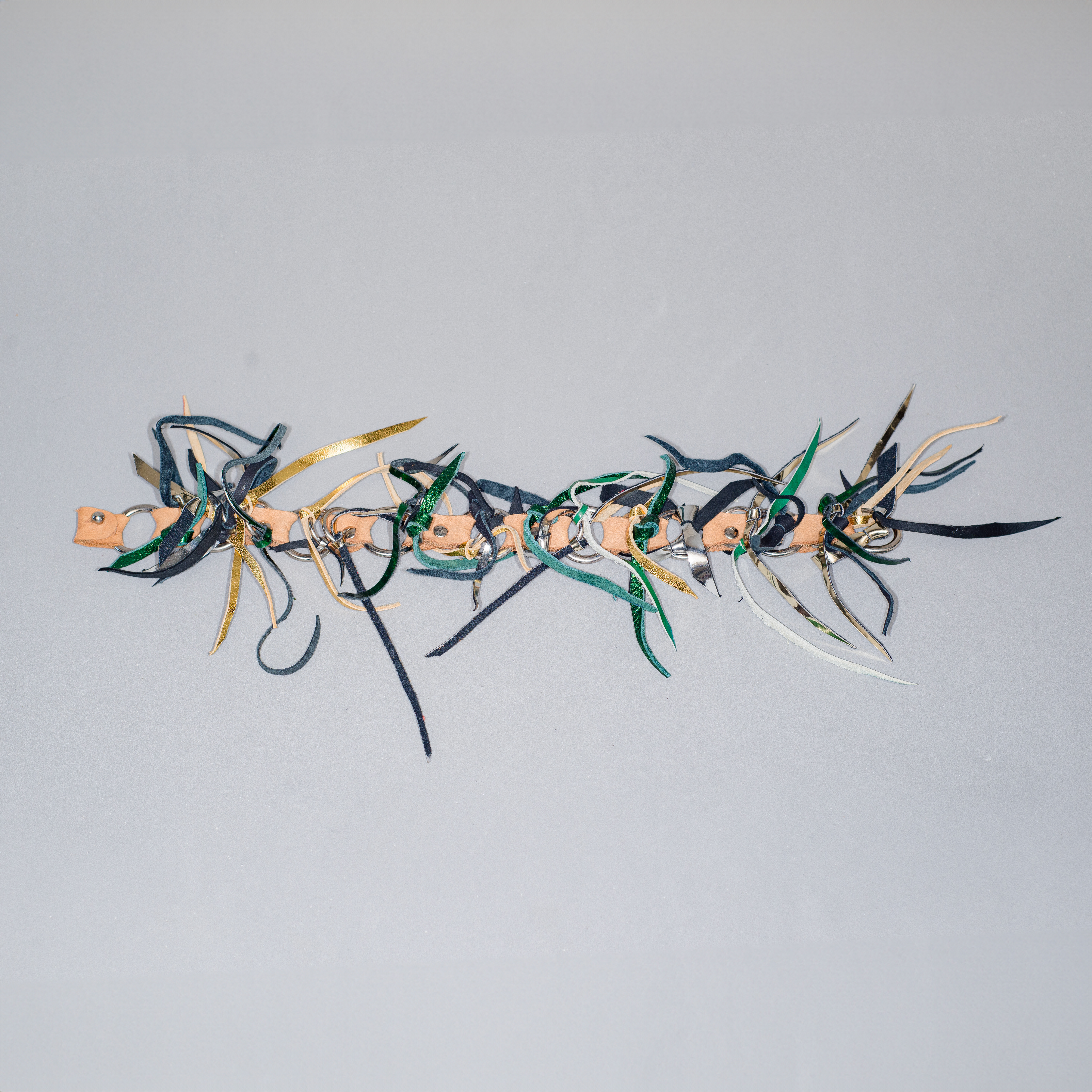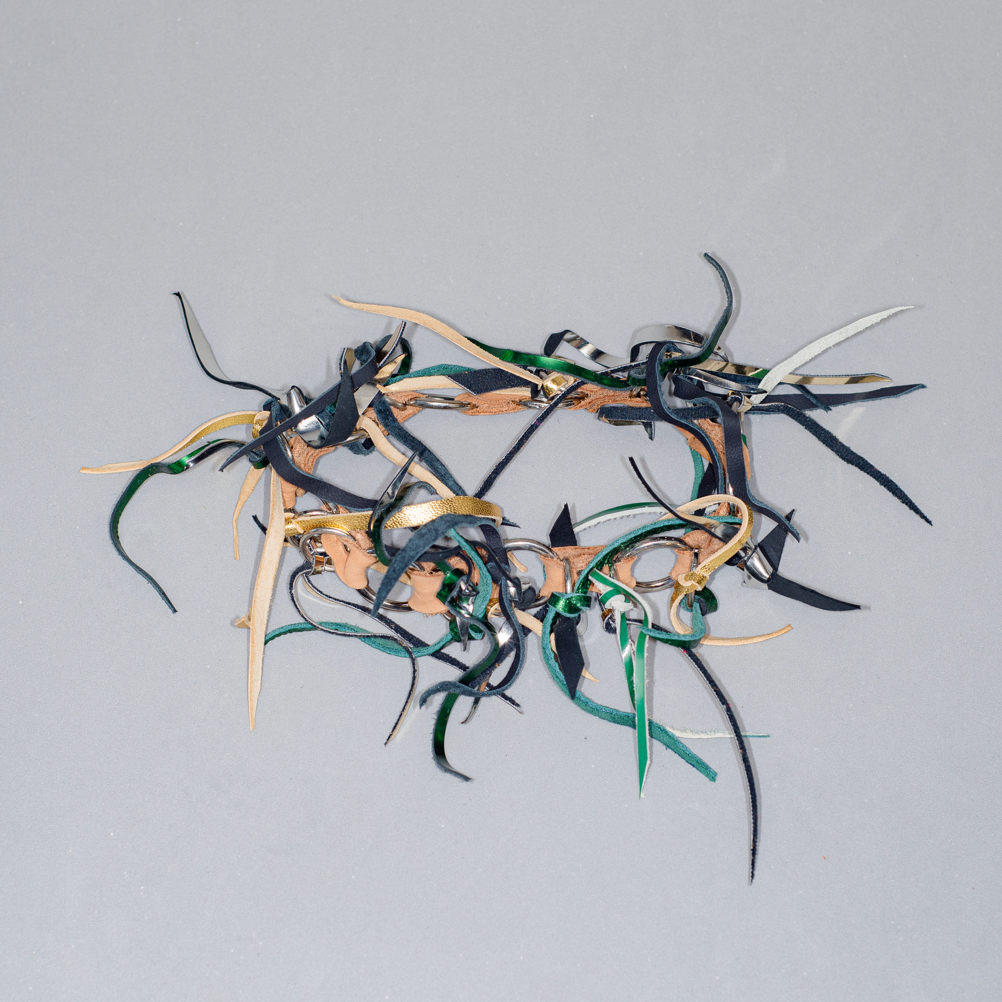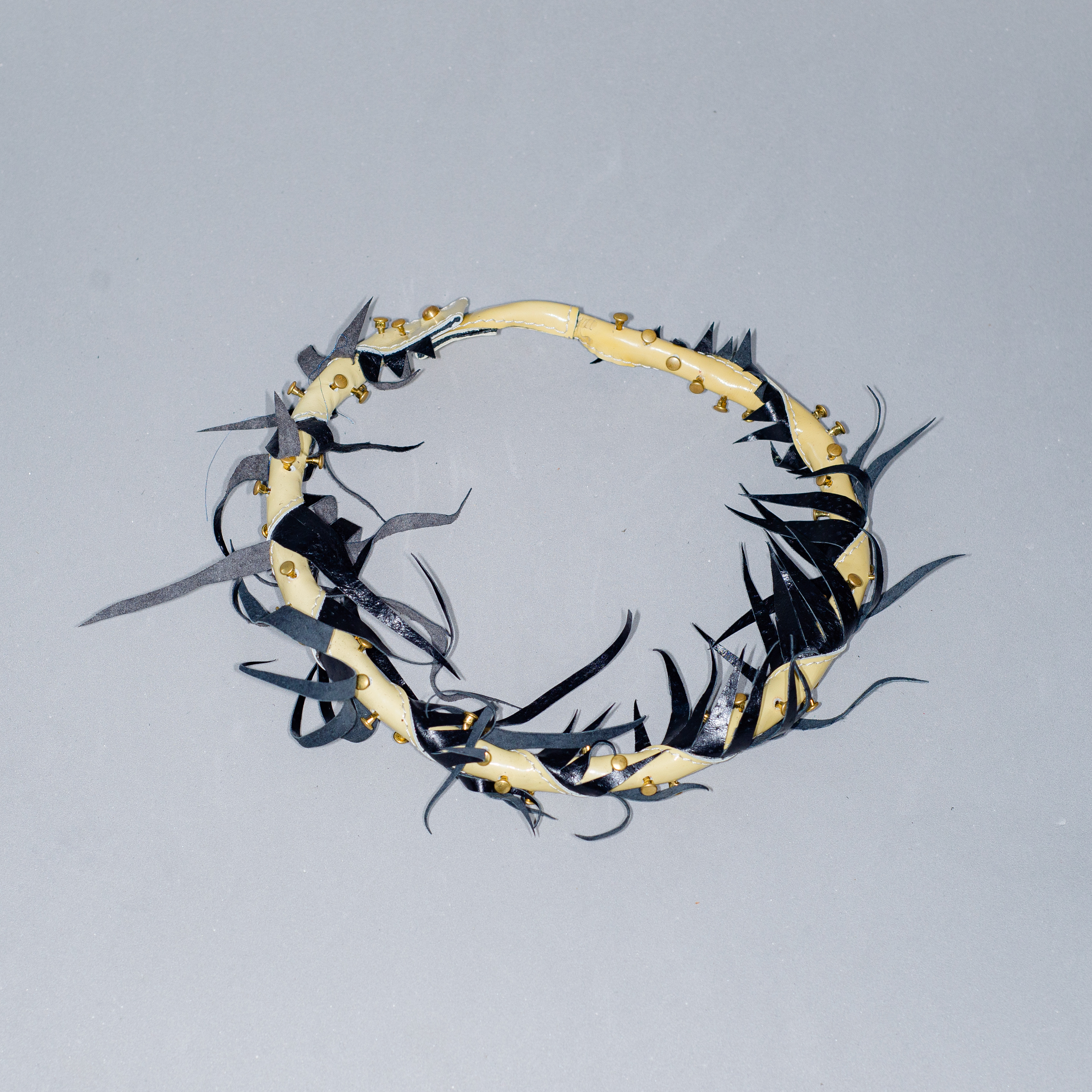 Una pieza de cabeza construida a partir de tiras de cuero negro y anillas metálicas entrelazadas, formando una malla que recuerda a la armadura y al atuendo ritual.