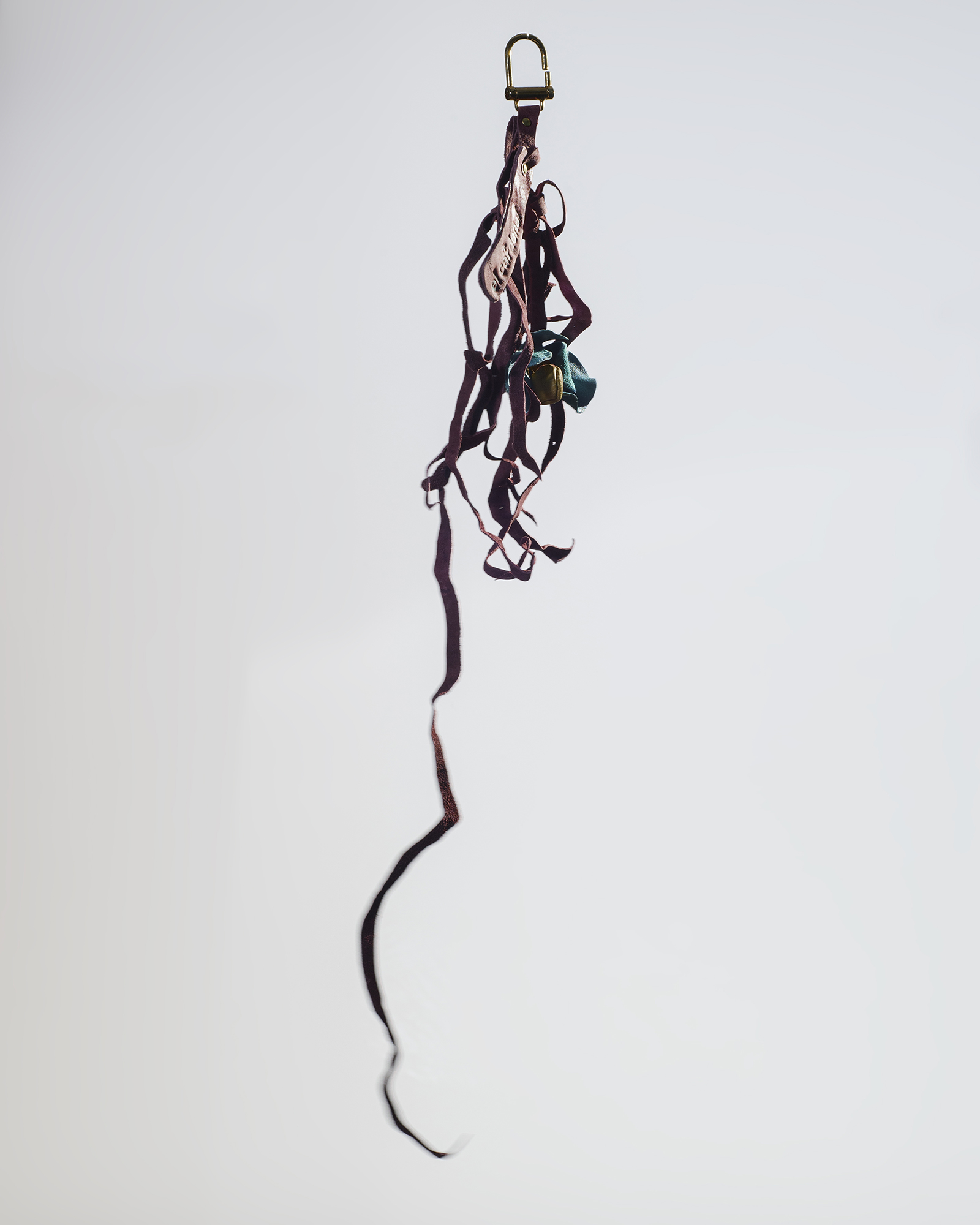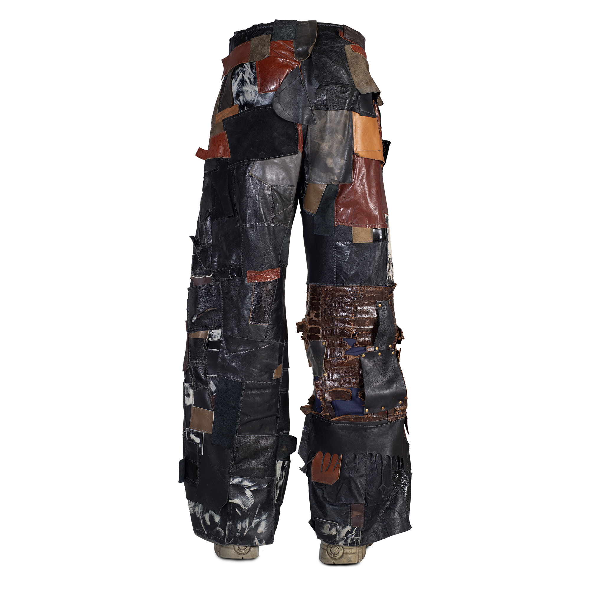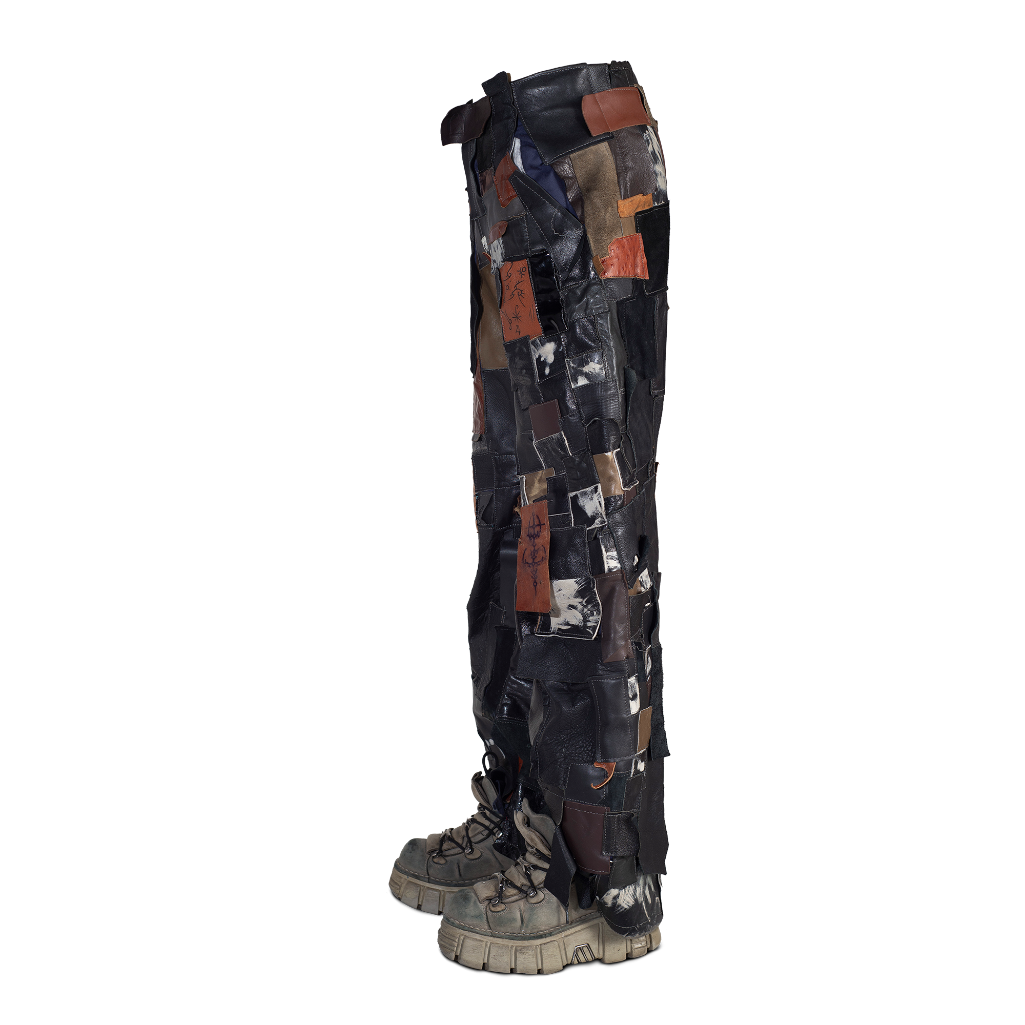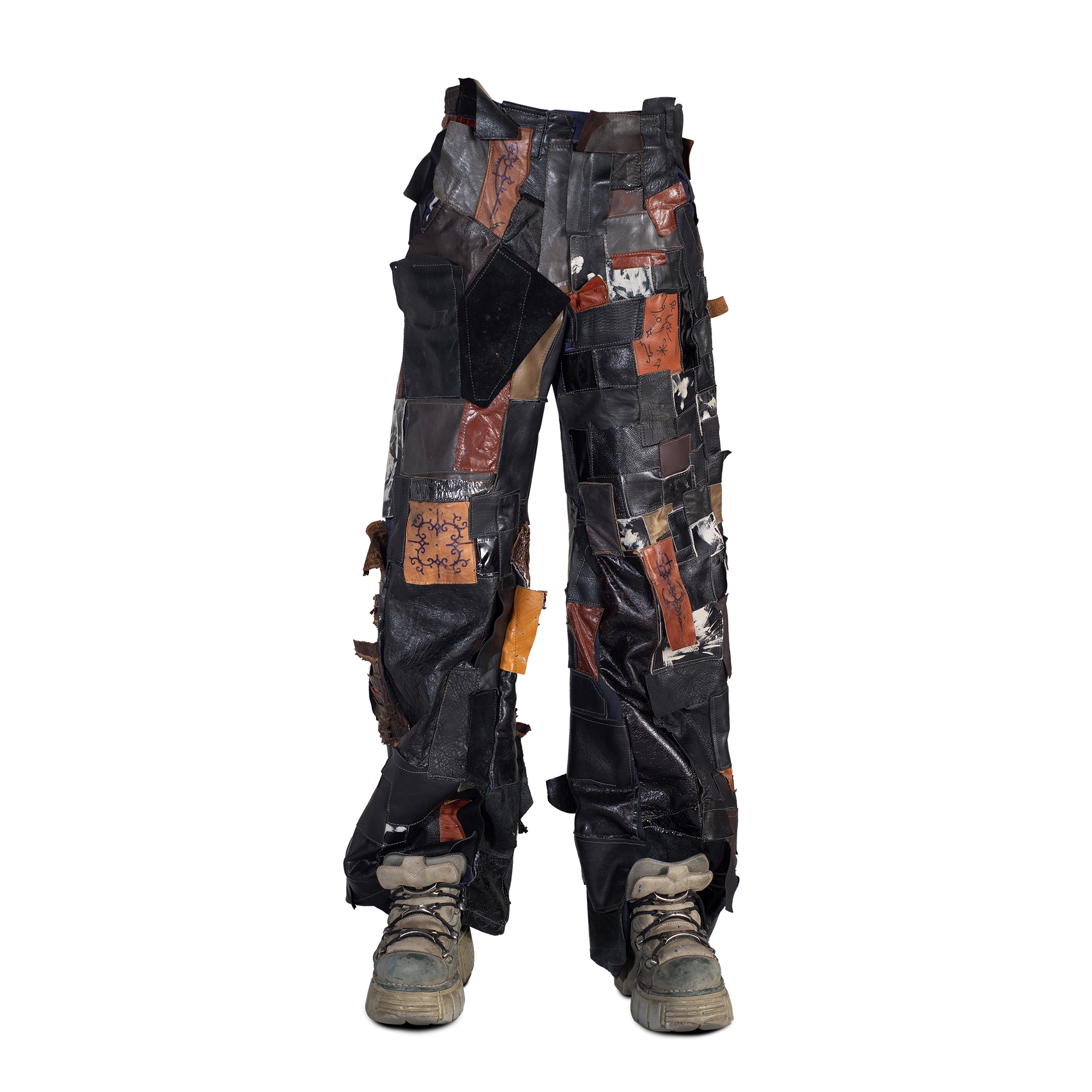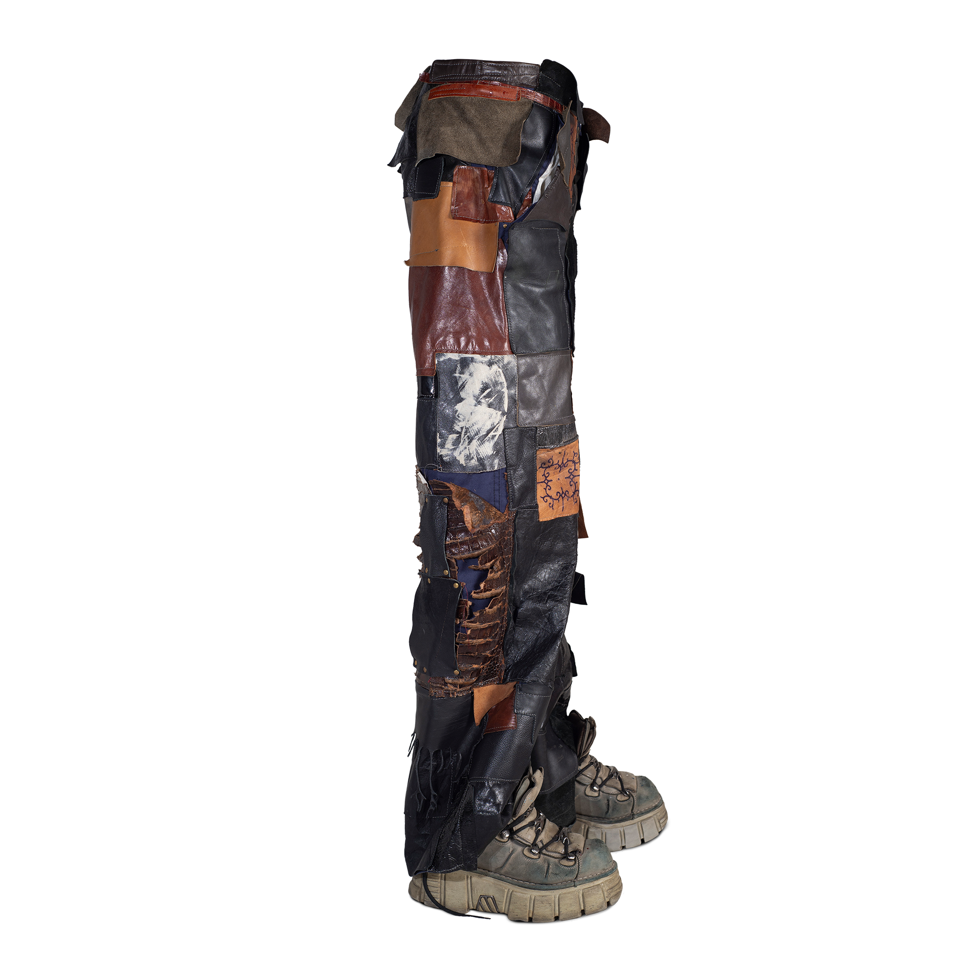 Una pieza de cabeza construida a partir de tiras de cuero negro y anillas metálicas entrelazadas, formando una malla que recuerda a la armadura y al atuendo ritual.
