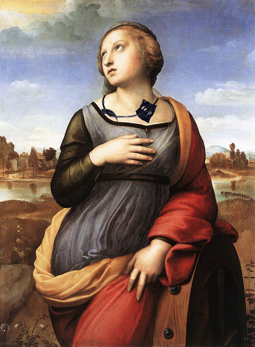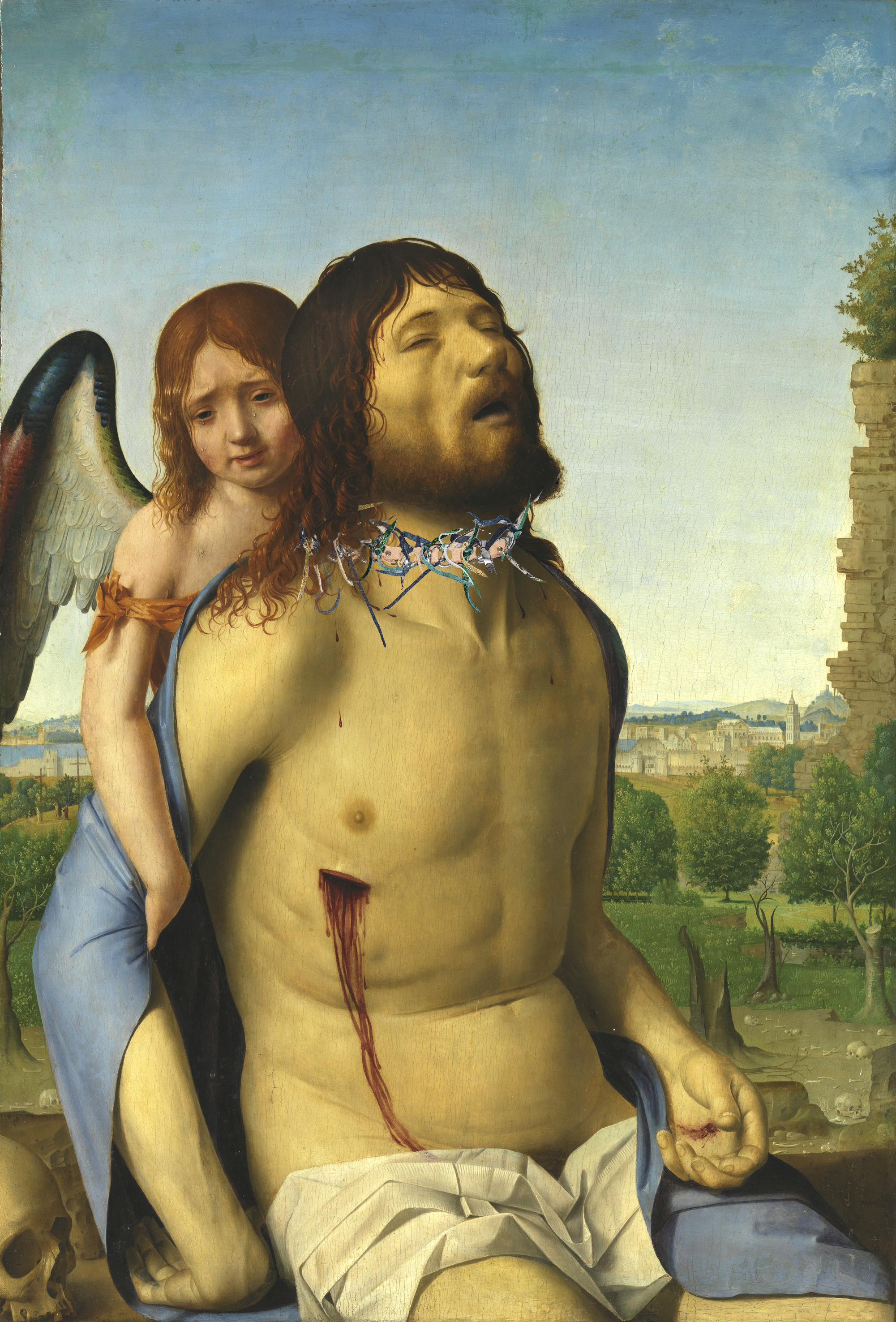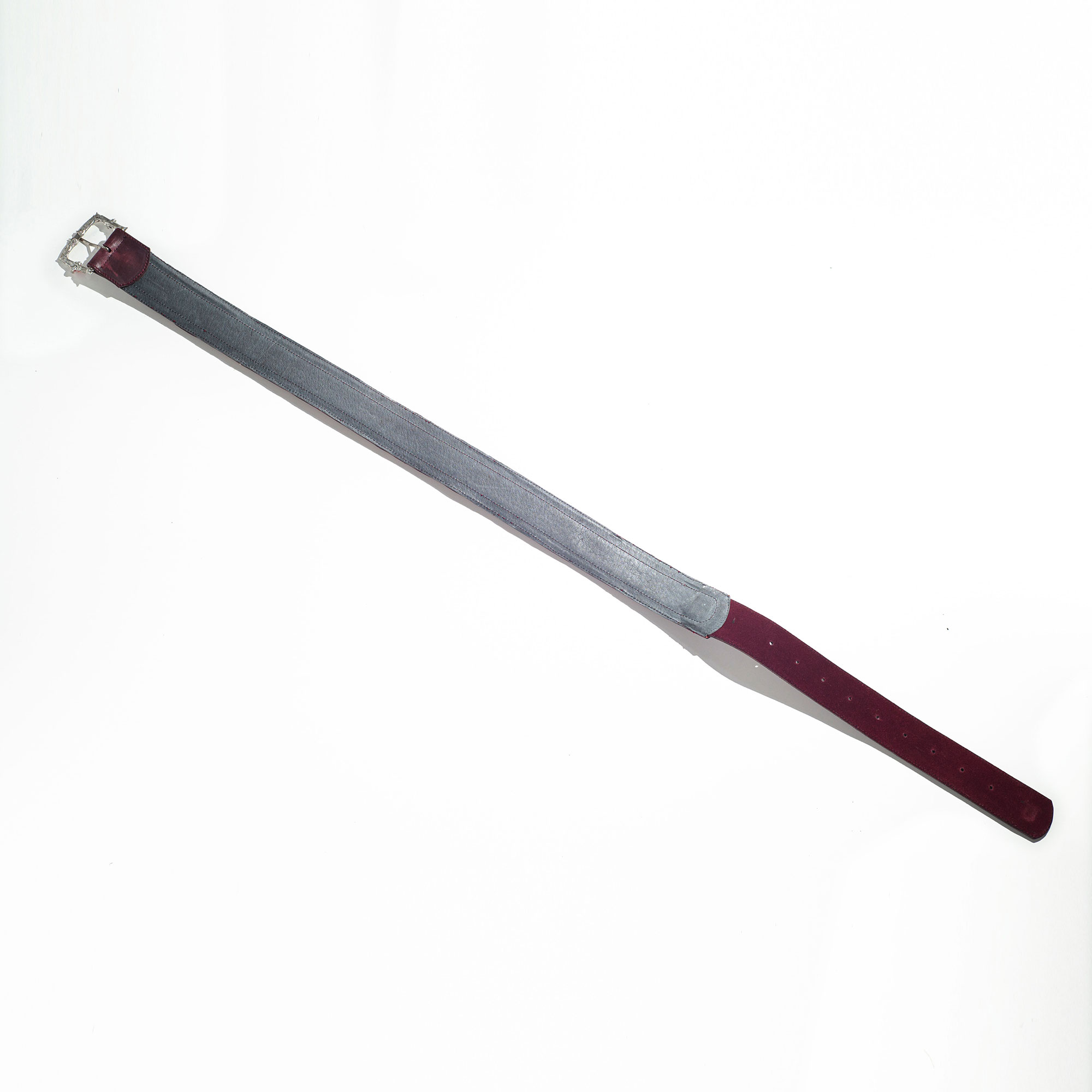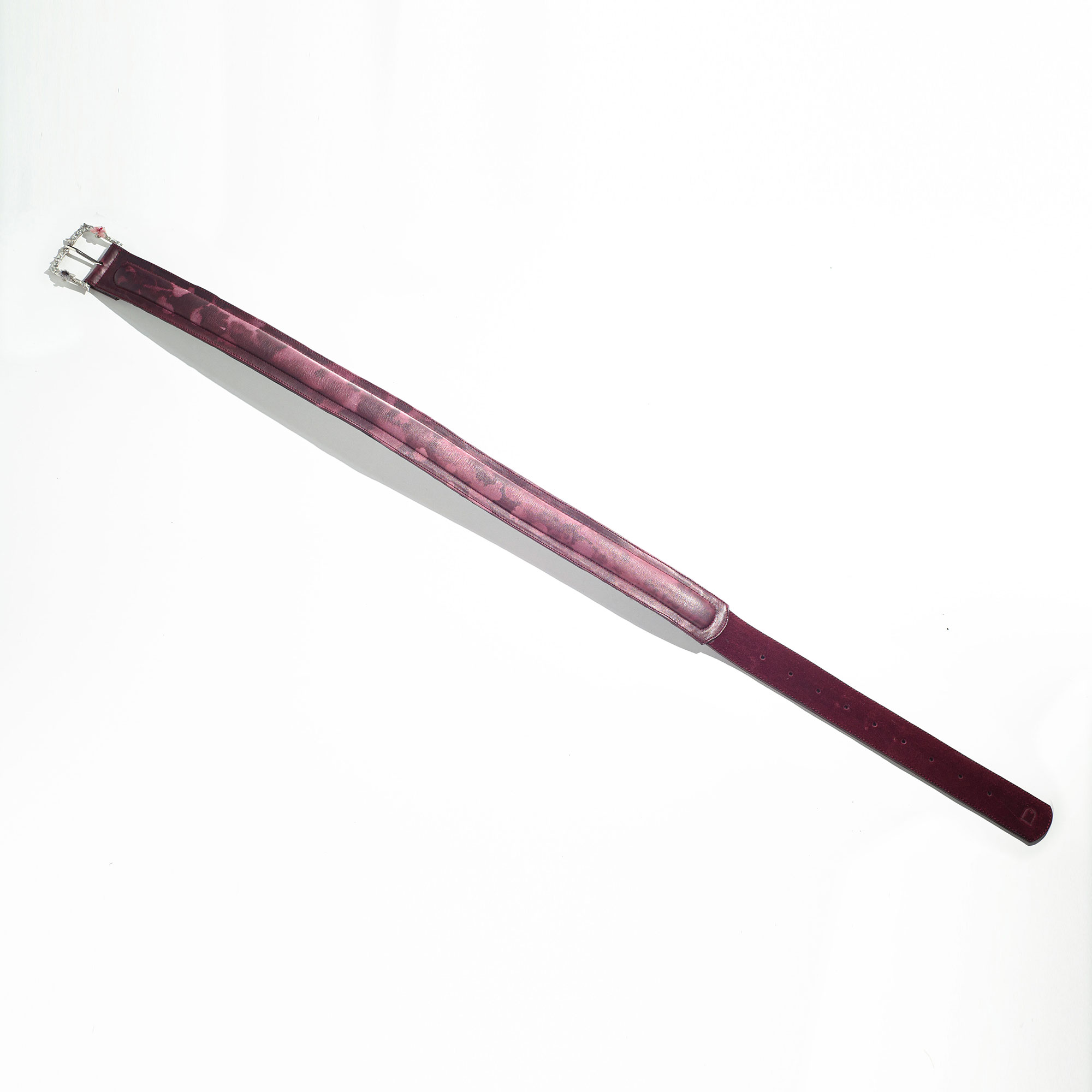 Una pieza de cabeza construida a partir de tiras de cuero negro y anillas metálicas entrelazadas, formando una malla que recuerda a la armadura y al atuendo ritual.