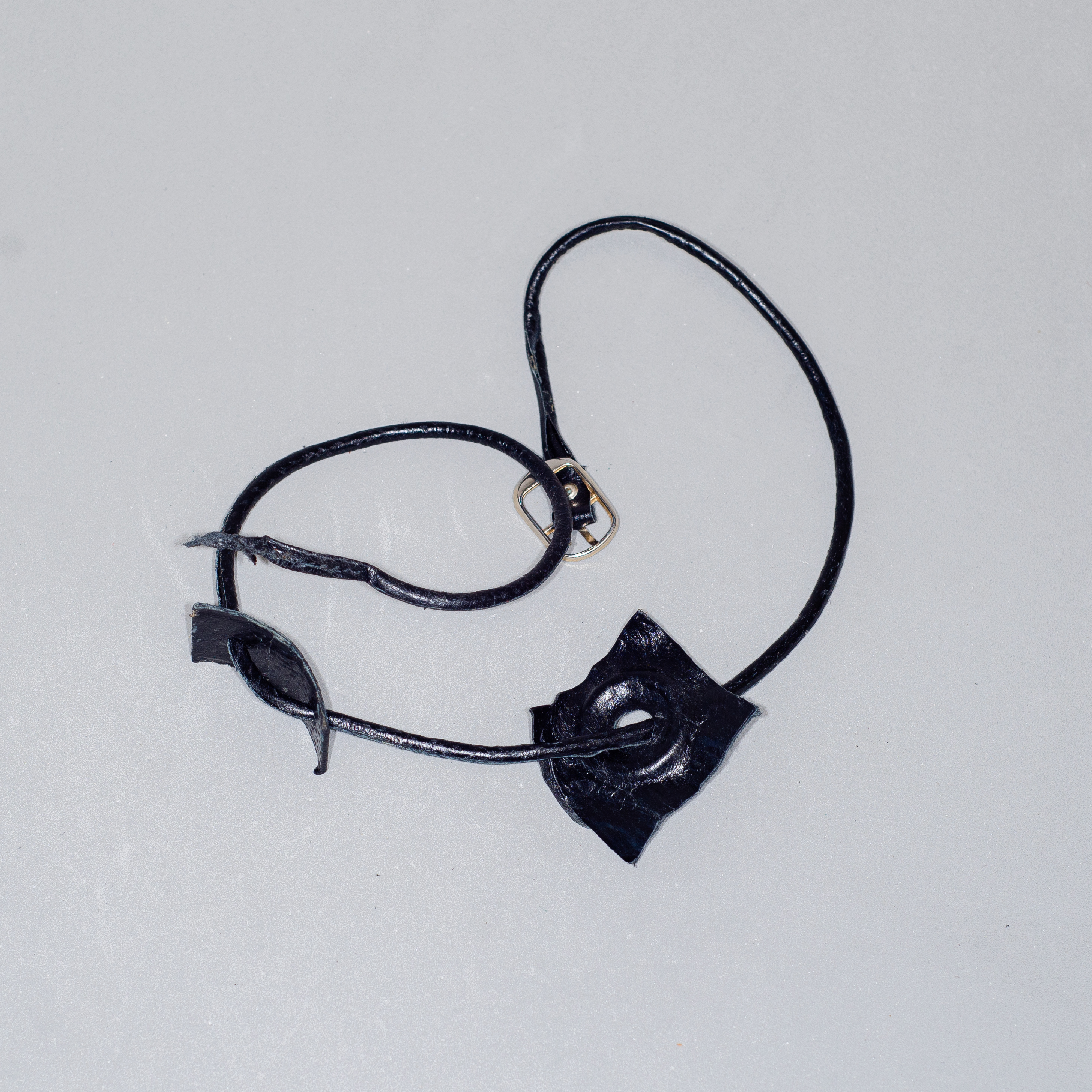 A headpiece built from interlocking black leather strips and metal rings, creating a mesh that recalls armor and ritual wear.