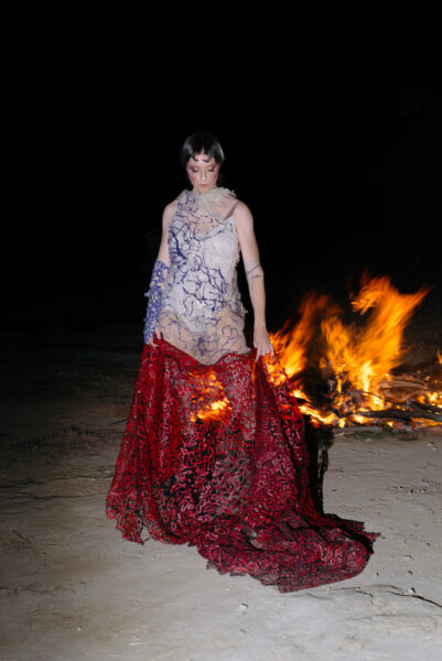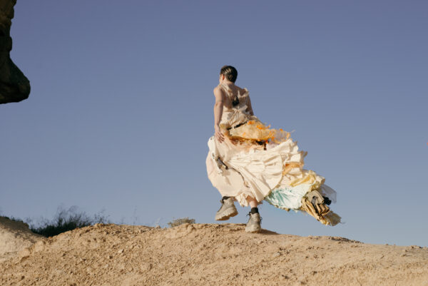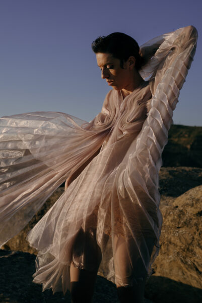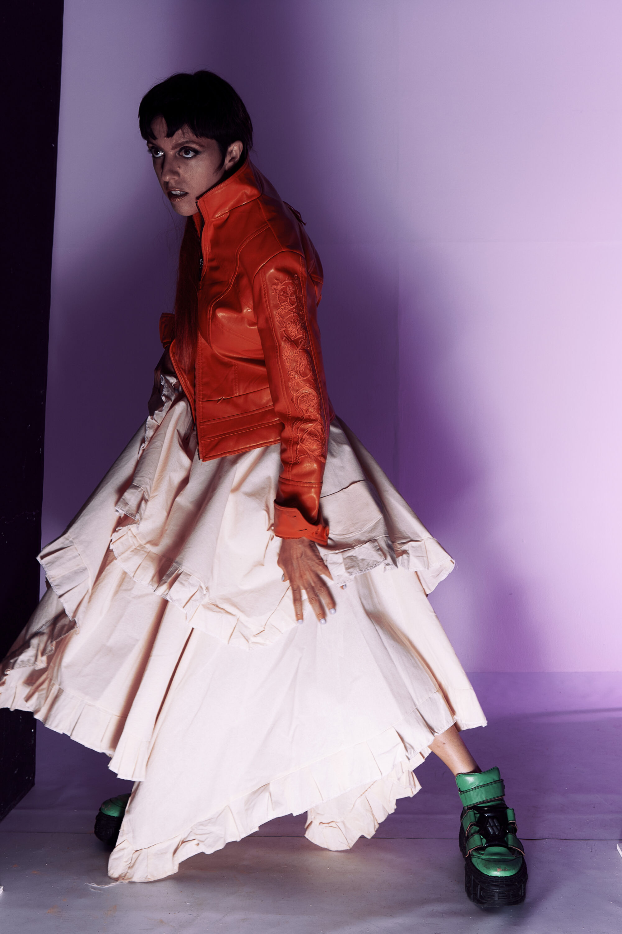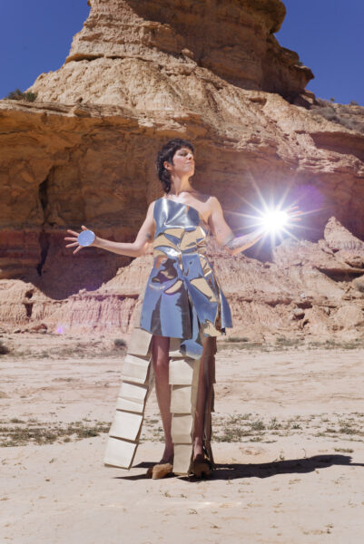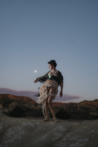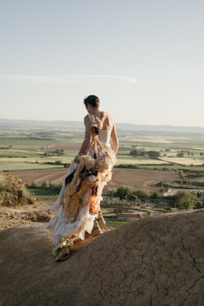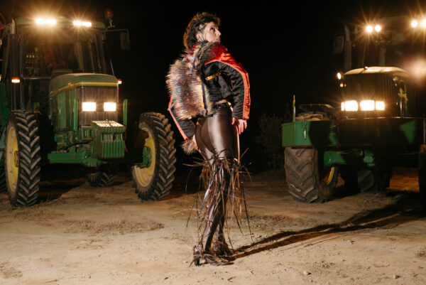 Para los videoclips de Remedios concebimos una línea estética que atravesara lo sagrado y lo campesino, lo visionario y lo terreno. En el atelier de el Cardenal desarrollamos prendas específicamente para ella —esculturas de cuero, tejidos oxidados, superficies que parecían arrancadas de un paisaje— que se mezclaron con piezas de archivo, transformaciones y colaboraciones con otras marcas como BUJ Studio o Cherry Massia. El resultado es un vestuario fragmentado y a la vez coherente: cuerpos que se visten de metal brillante como espejismos solares, vestidos que arrastran raíces y sedimentos, pantalones que brillan frente a tractores como si fueran tótems futuristas, túnicas ceremoniales que alzan ramas y espadas, encajes consumidos por el fuego y gasas que respiran al viento. Cada estilismo se pensó como un ritual: una forma de encarnar en el cuerpo la tensión entre tierra y cielo, destrucción y renacimiento, con la misma violencia poética que atraviesa la música de Le Parody.