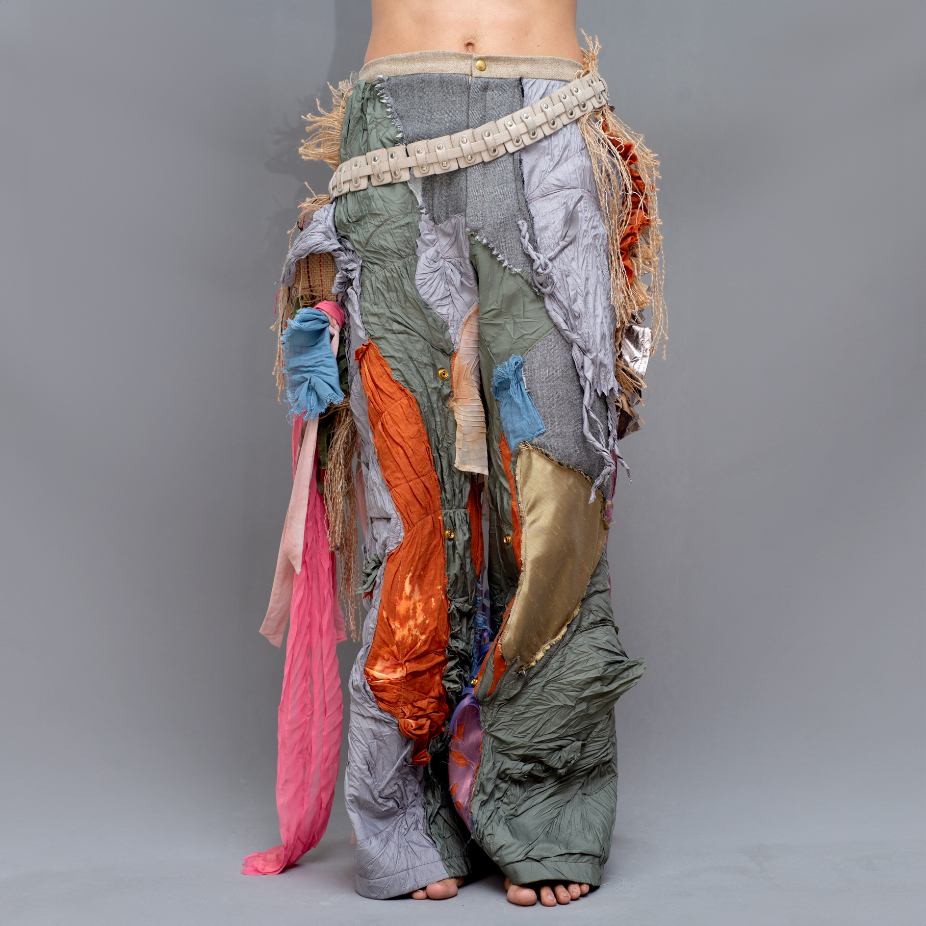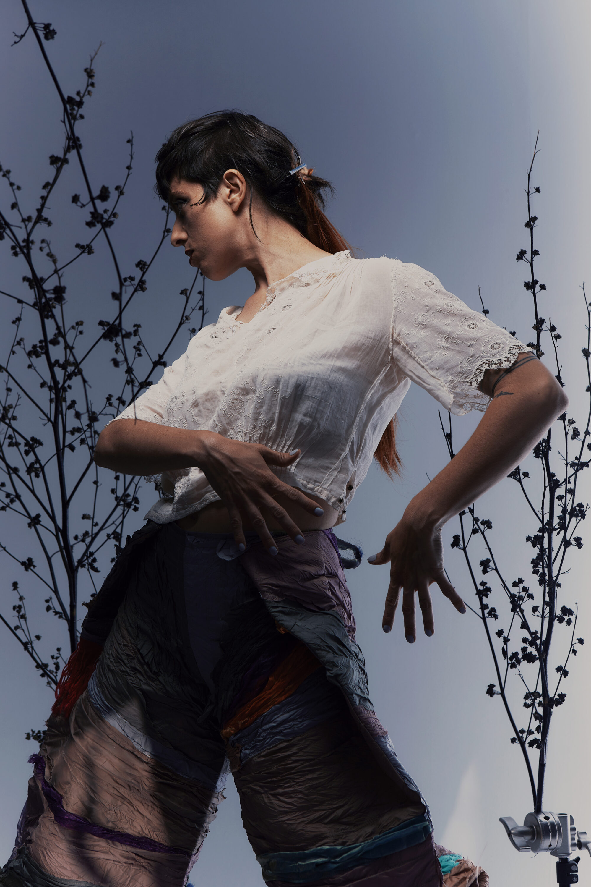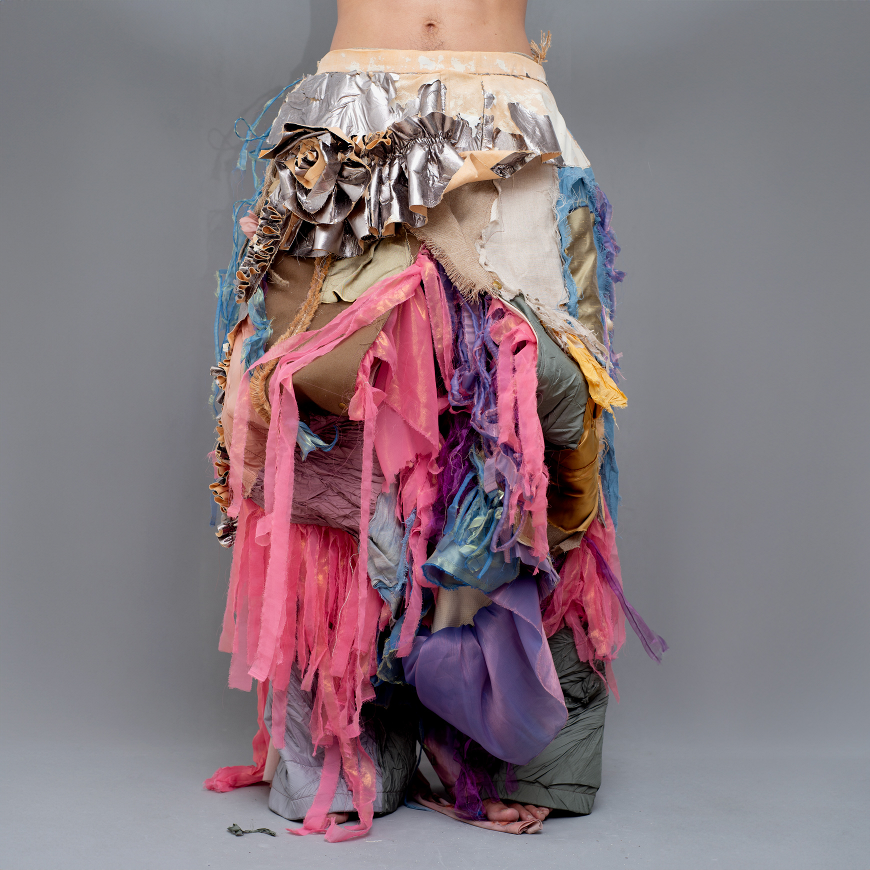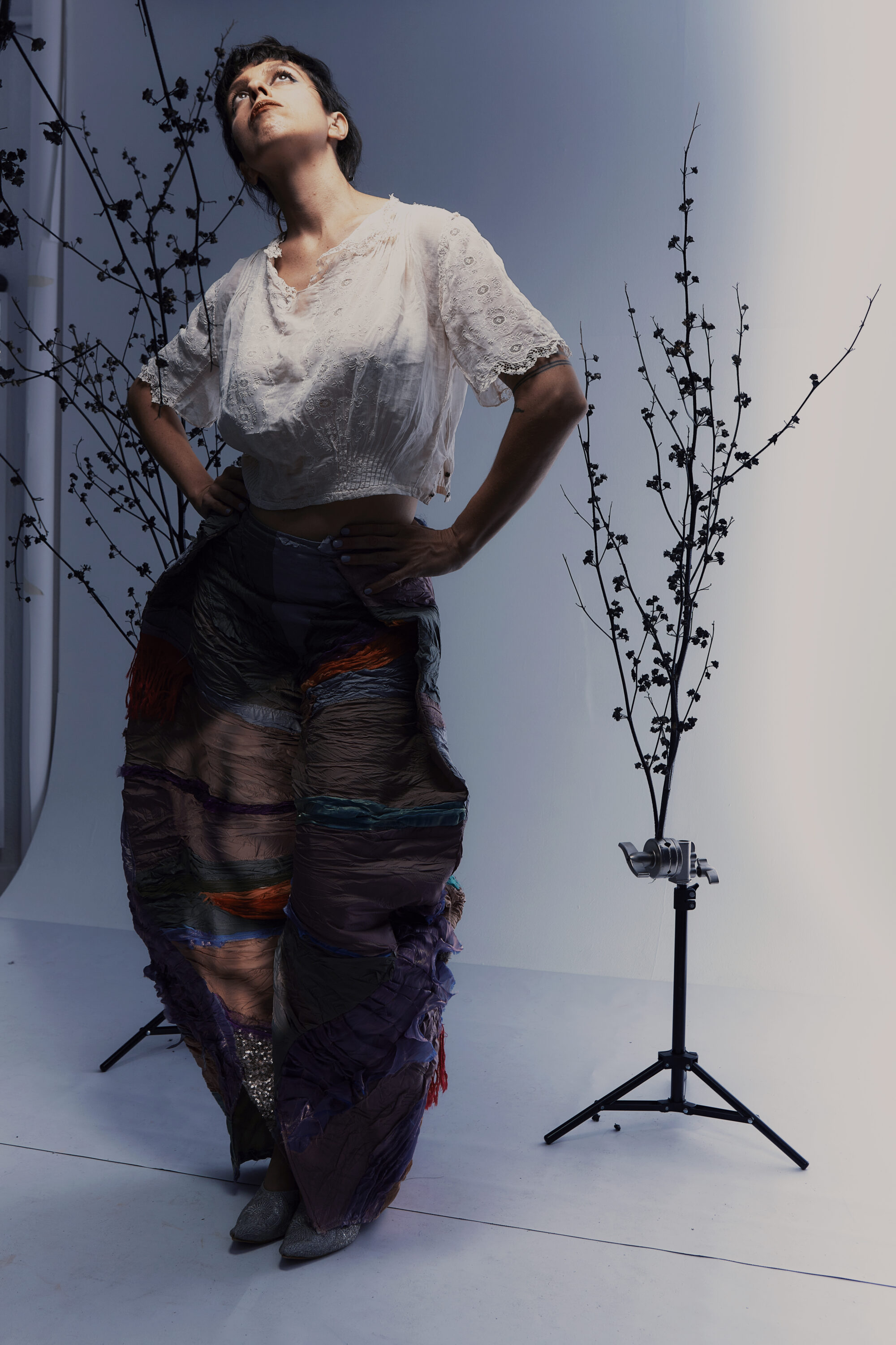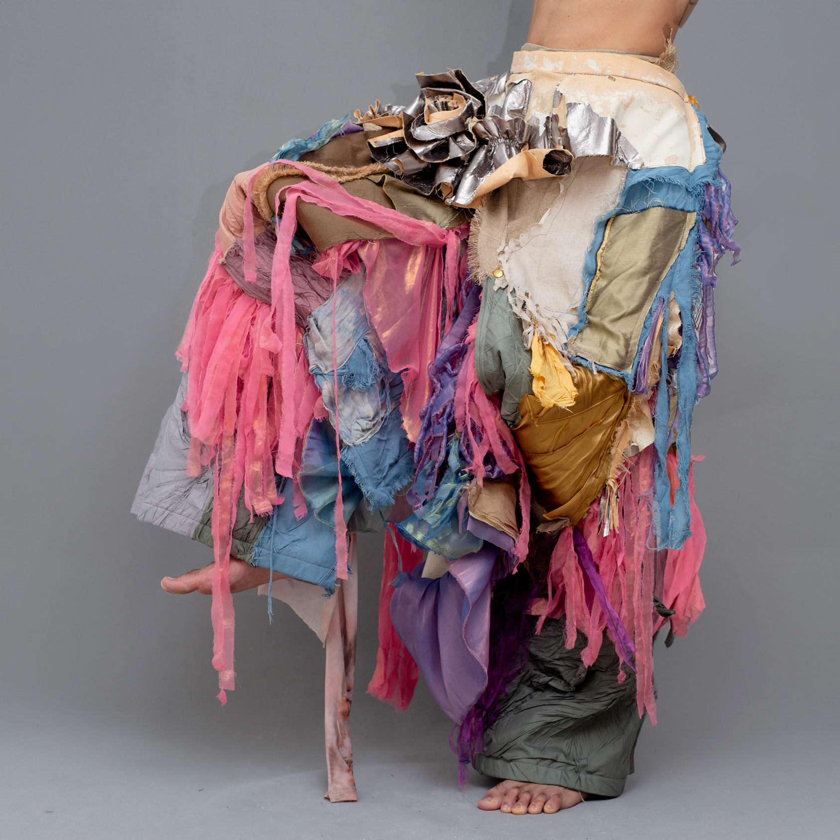 El vestuario de la gira de Remedios se articula en tres piezas únicas que nacen de tejidos recuperados y sometidos a nuevas mutaciones. Son fragmentos del pasado cosidos con la urgencia del presente, como restos que insisten en transformarse en cuerpo vivo. Cada prenda guarda la huella de un exceso antiguo y la convierte en símbolo, reclamando que ya no hace falta producir más para invocar belleza. En ellas conviven cicatrices textiles, colores velados y arrugas tensadas, como si la memoria del material se rebelara contra el olvido.