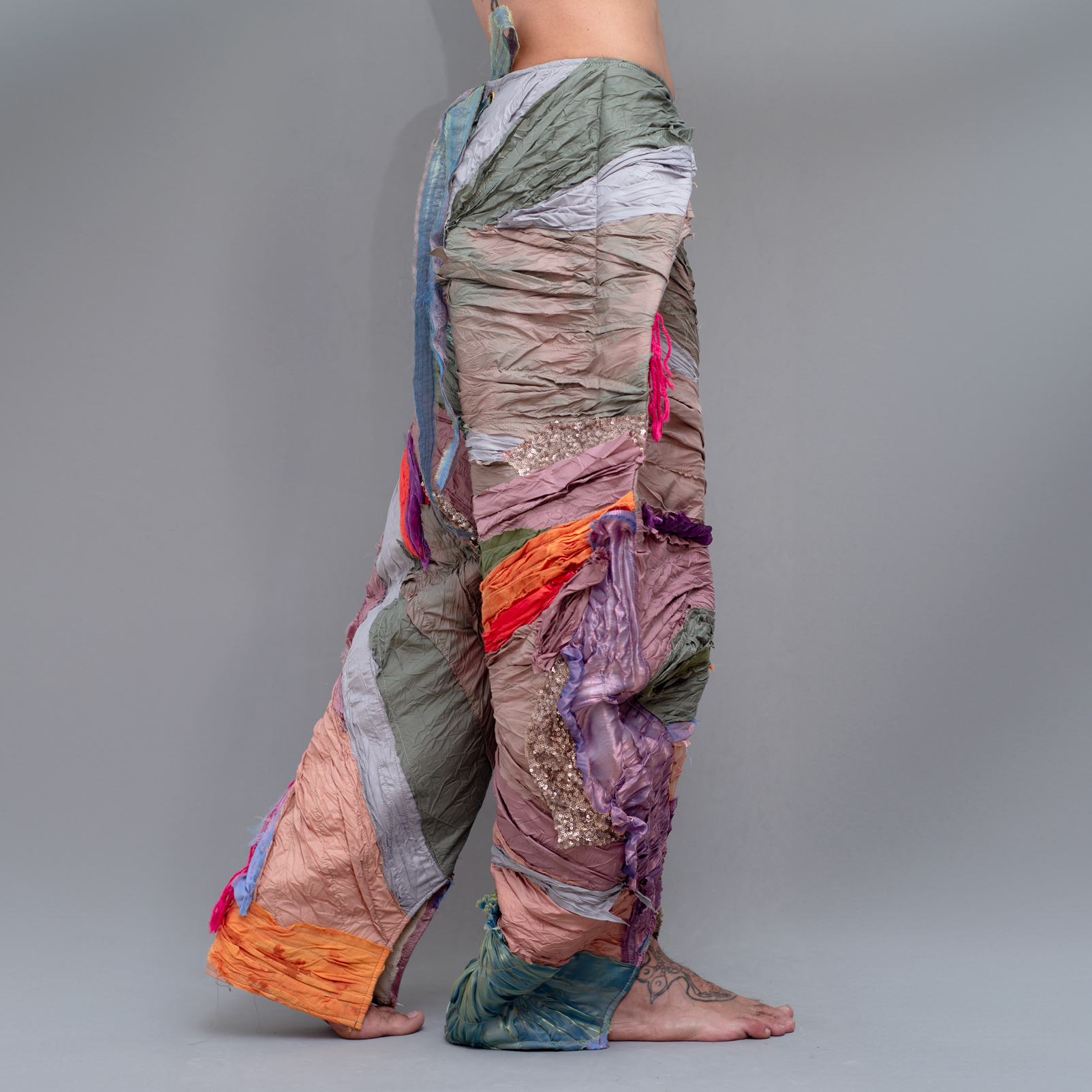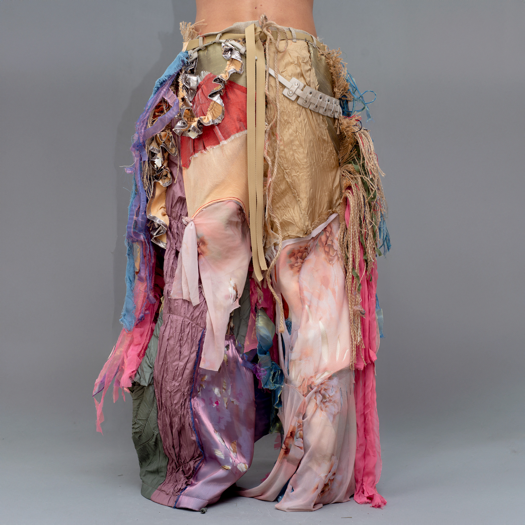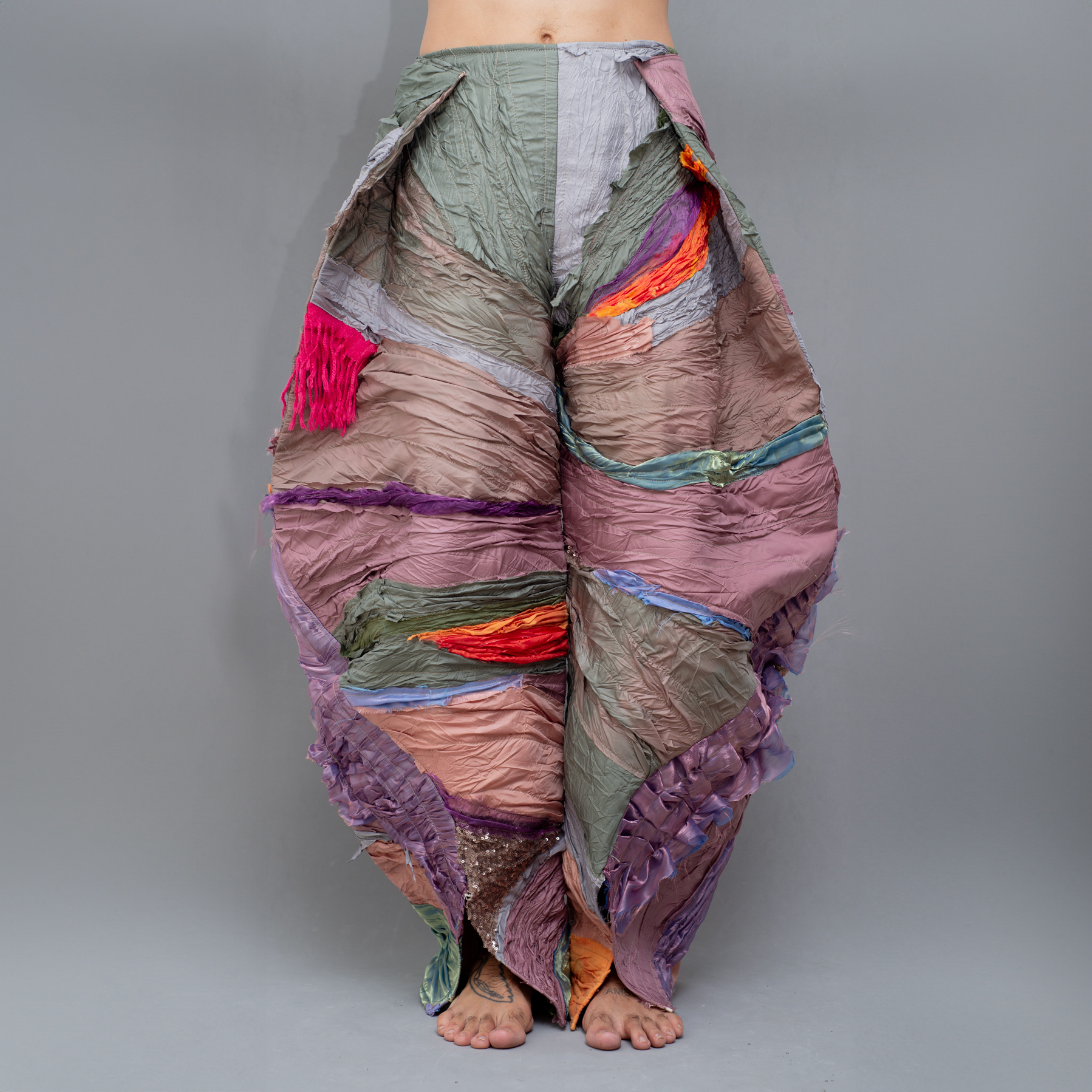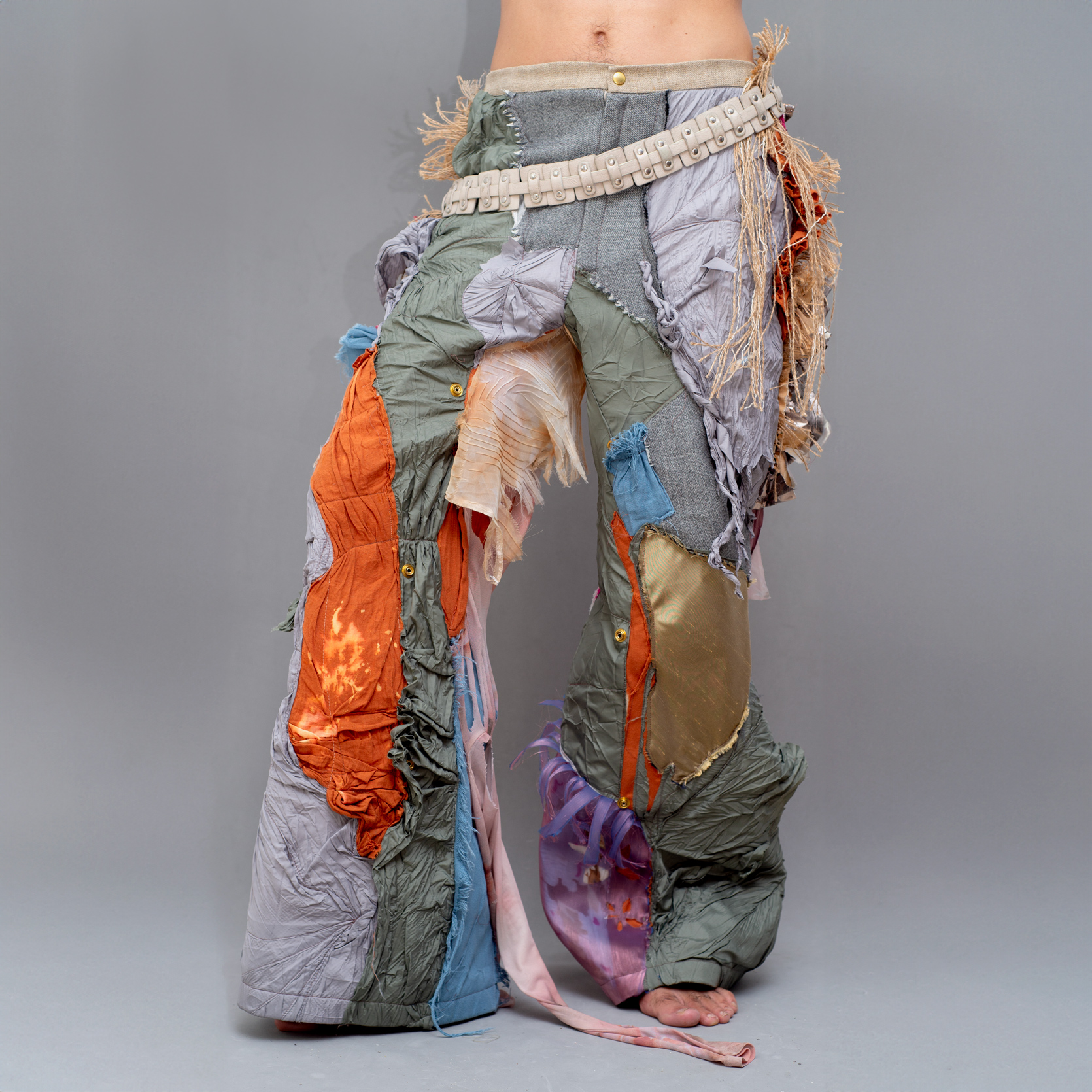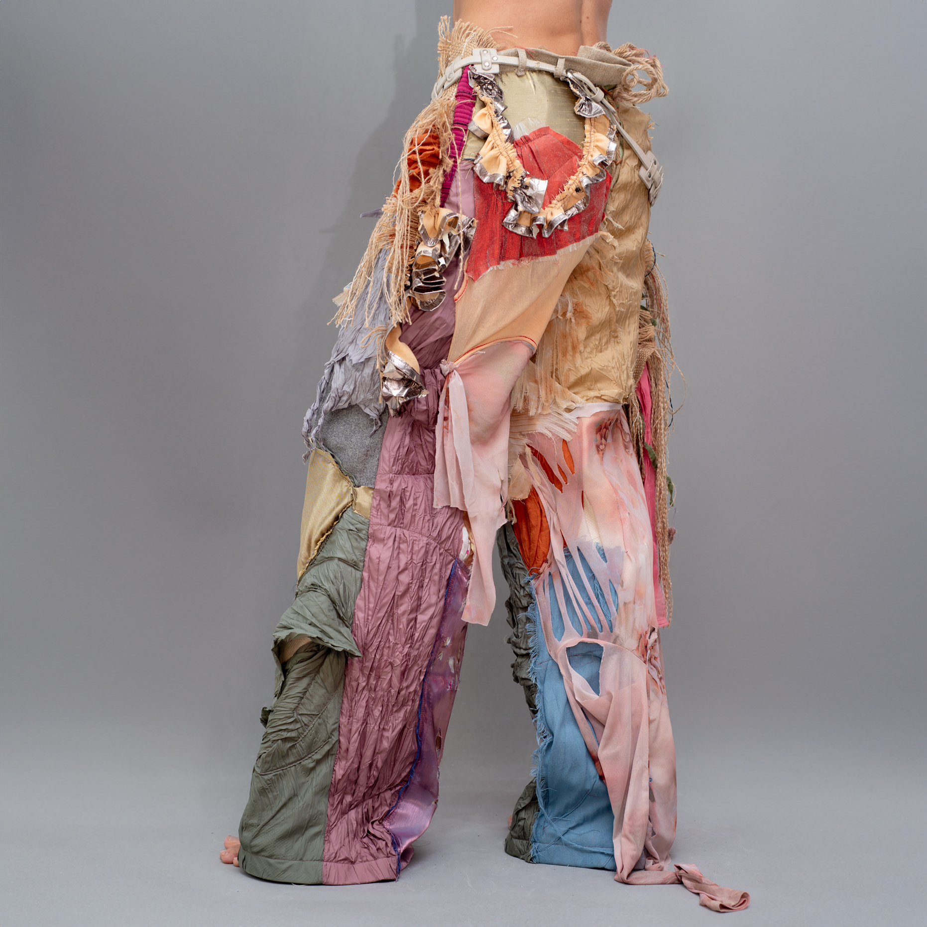 El vestuario de la gira de Remedios se articula en tres piezas únicas que nacen de tejidos recuperados y sometidos a nuevas mutaciones. Son fragmentos del pasado cosidos con la urgencia del presente, como restos que insisten en transformarse en cuerpo vivo. Cada prenda guarda la huella de un exceso antiguo y la convierte en símbolo, reclamando que ya no hace falta producir más para invocar belleza. En ellas conviven cicatrices textiles, colores velados y arrugas tensadas, como si la memoria del material se rebelara contra el olvido.