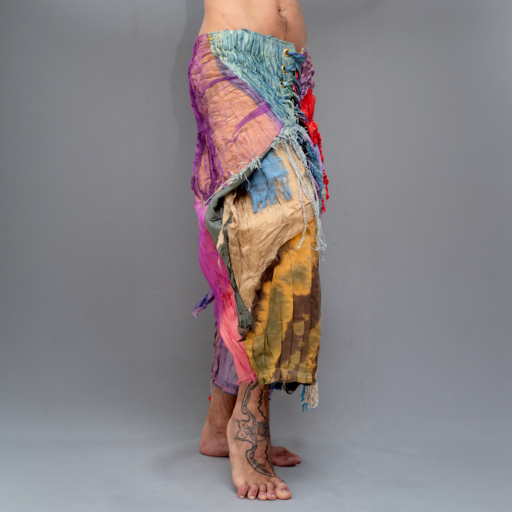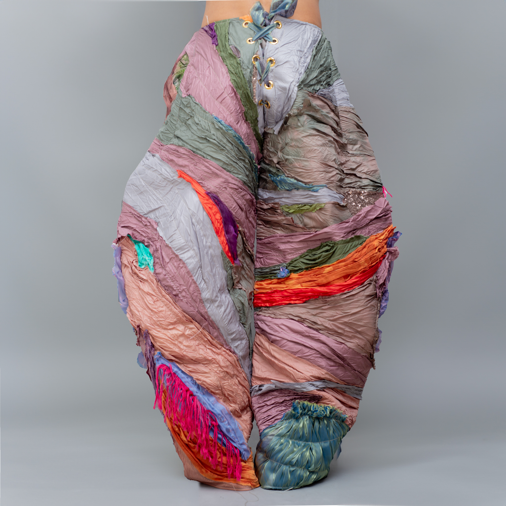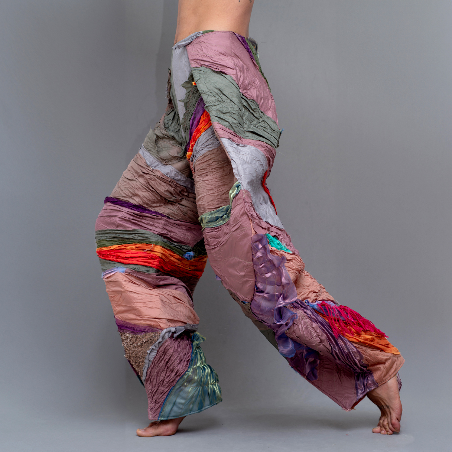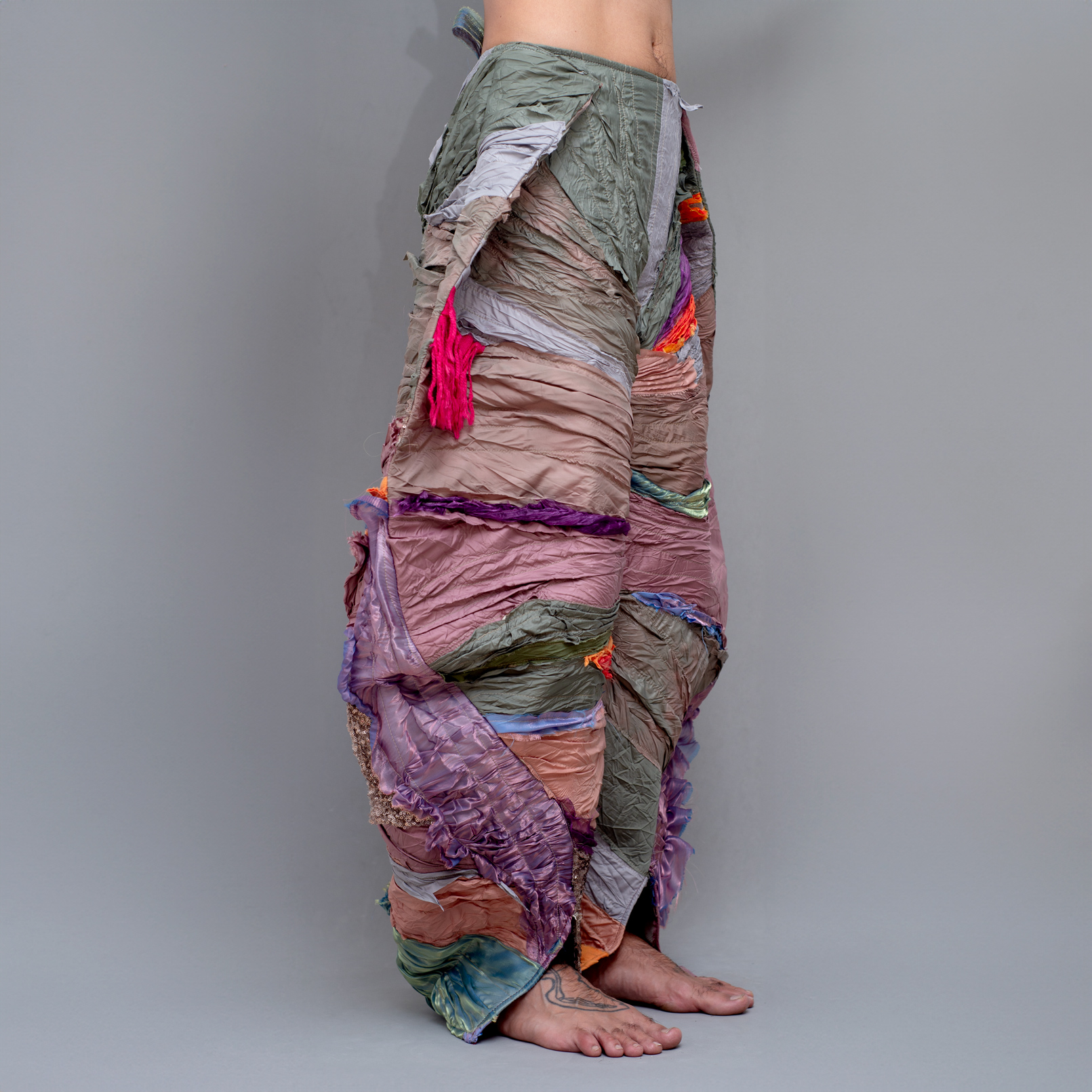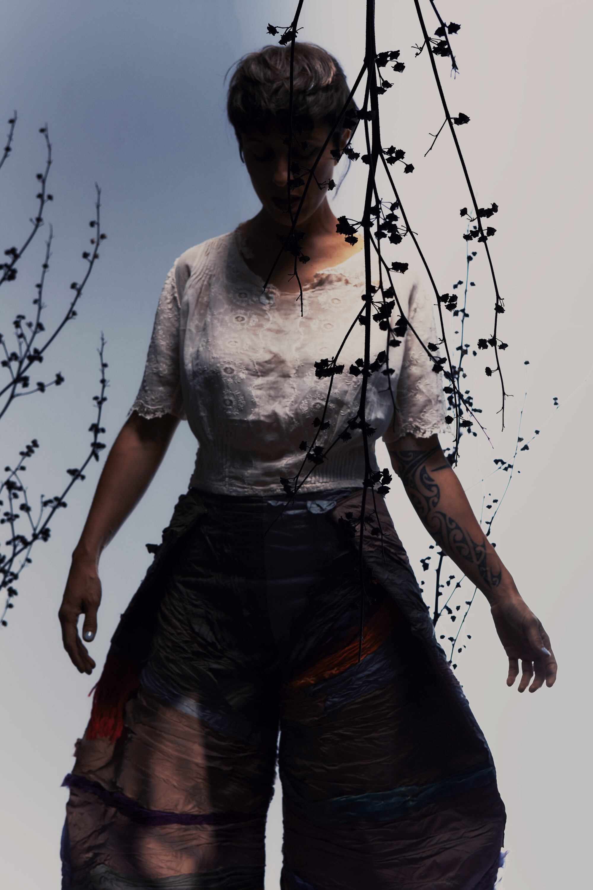 El vestuario de la gira de Remedios se articula en tres piezas únicas que nacen de tejidos recuperados y sometidos a nuevas mutaciones. Son fragmentos del pasado cosidos con la urgencia del presente, como restos que insisten en transformarse en cuerpo vivo. Cada prenda guarda la huella de un exceso antiguo y la convierte en símbolo, reclamando que ya no hace falta producir más para invocar belleza. En ellas conviven cicatrices textiles, colores velados y arrugas tensadas, como si la memoria del material se rebelara contra el olvido.