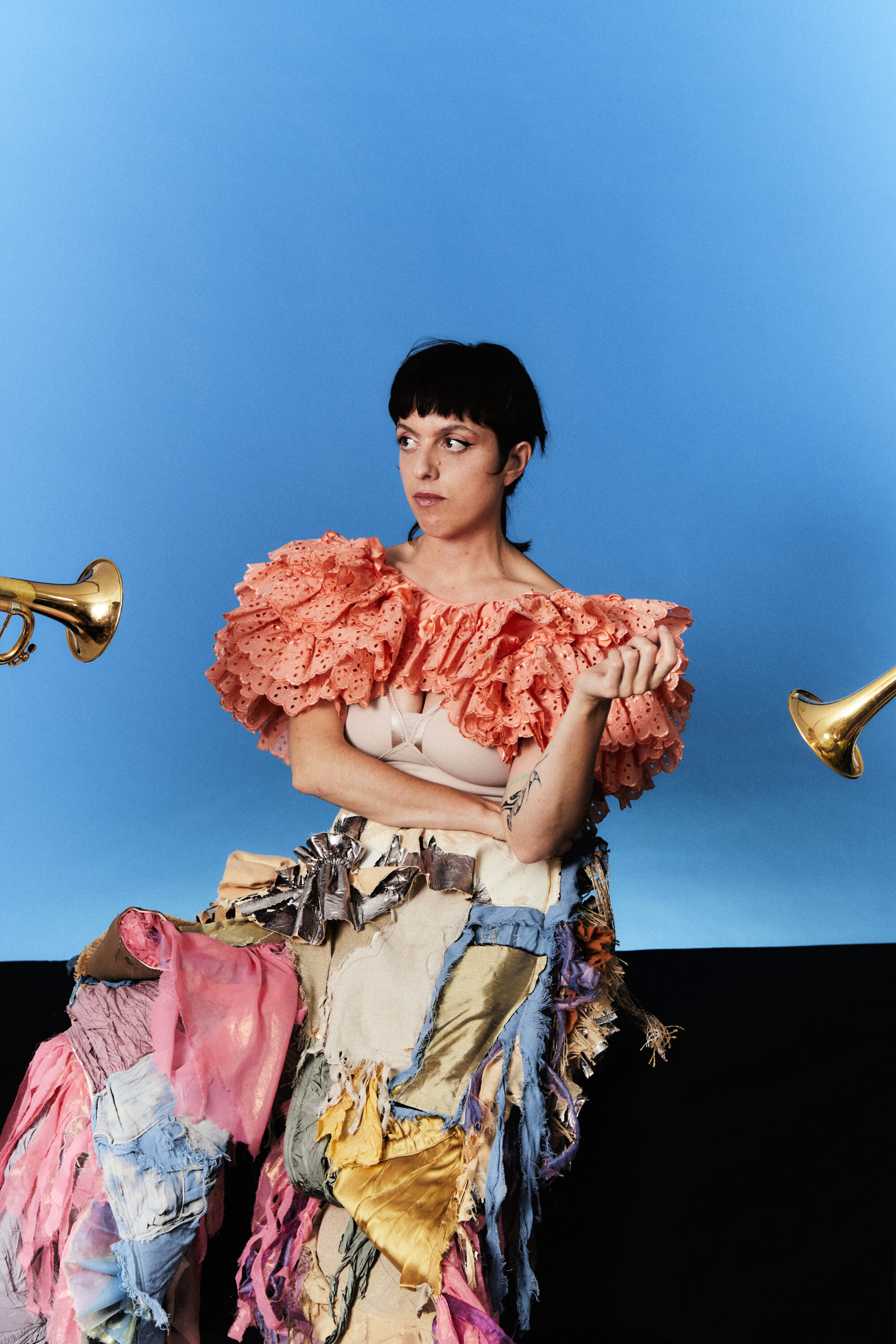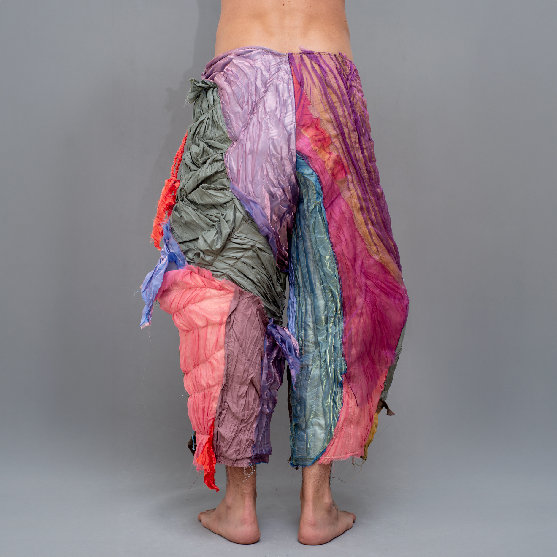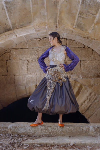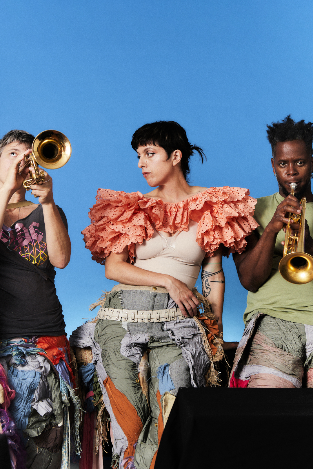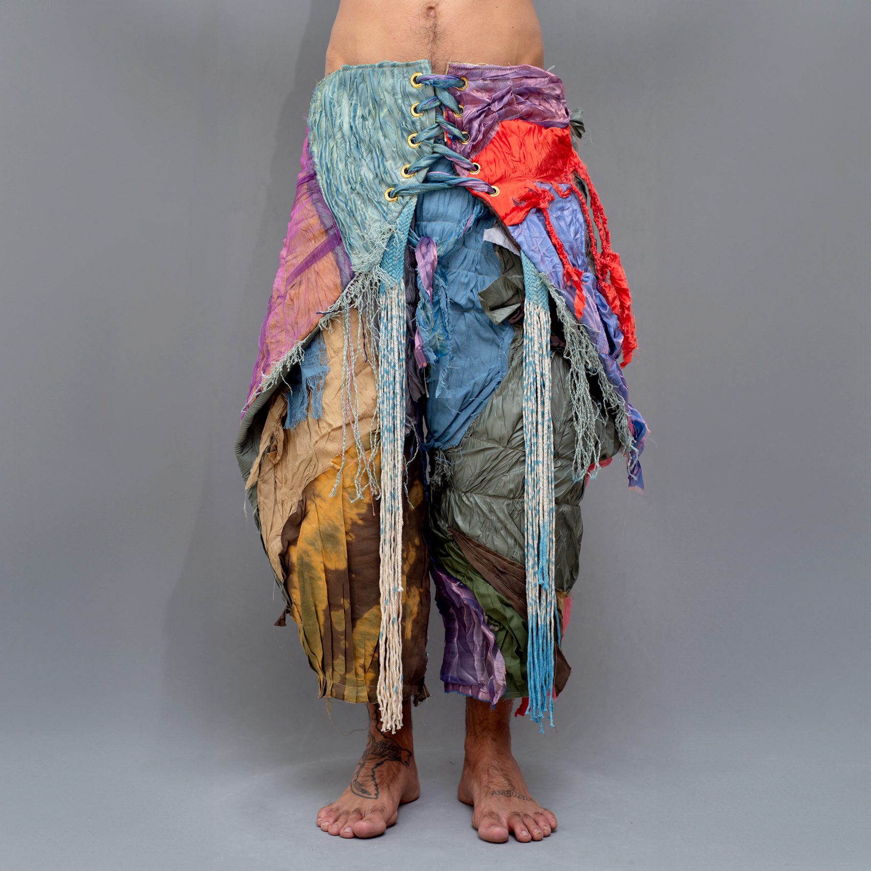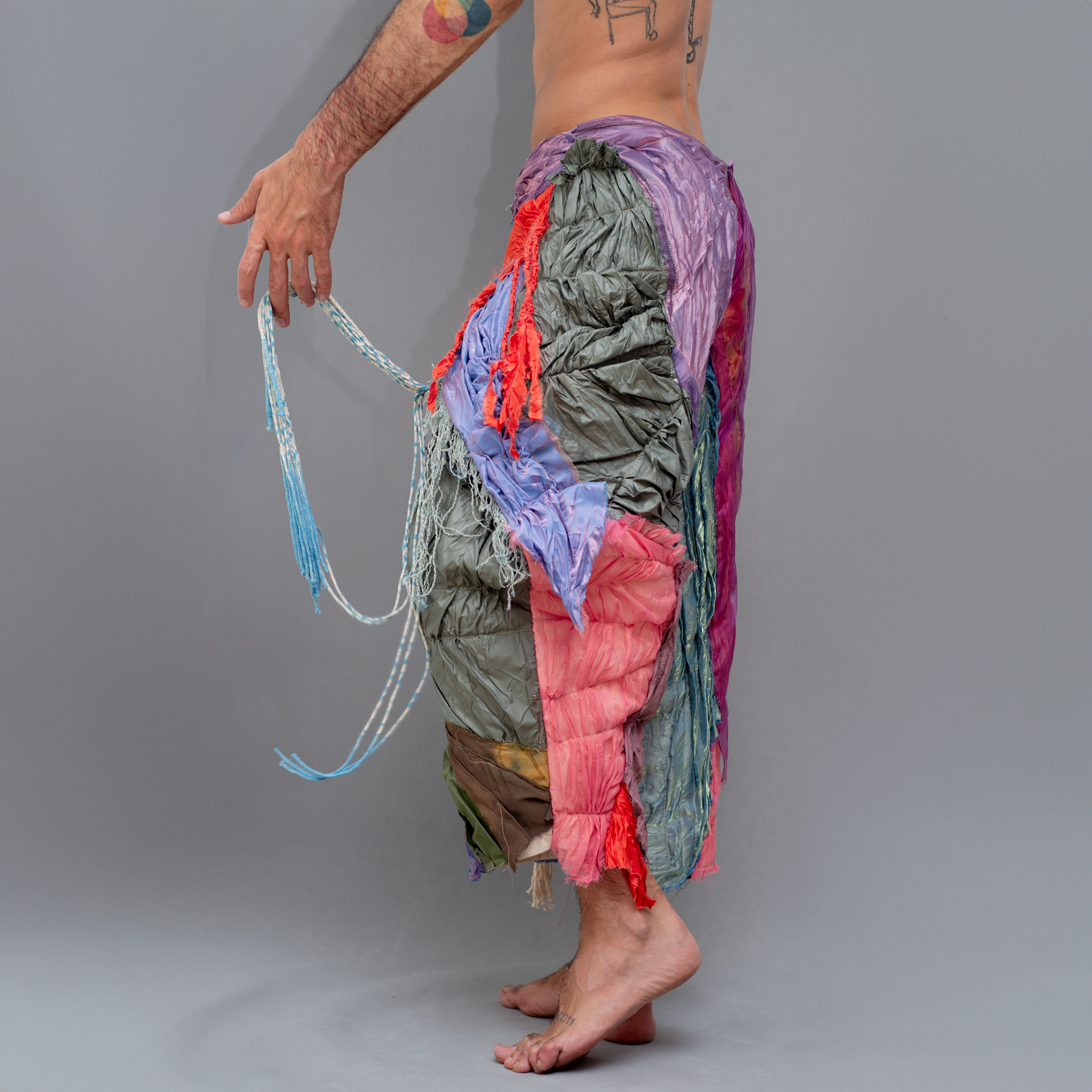 El vestuario de la gira de Remedios se articula en tres piezas únicas que nacen de tejidos recuperados y sometidos a nuevas mutaciones. Son fragmentos del pasado cosidos con la urgencia del presente, como restos que insisten en transformarse en cuerpo vivo. Cada prenda guarda la huella de un exceso antiguo y la convierte en símbolo, reclamando que ya no hace falta producir más para invocar belleza. En ellas conviven cicatrices textiles, colores velados y arrugas tensadas, como si la memoria del material se rebelara contra el olvido.